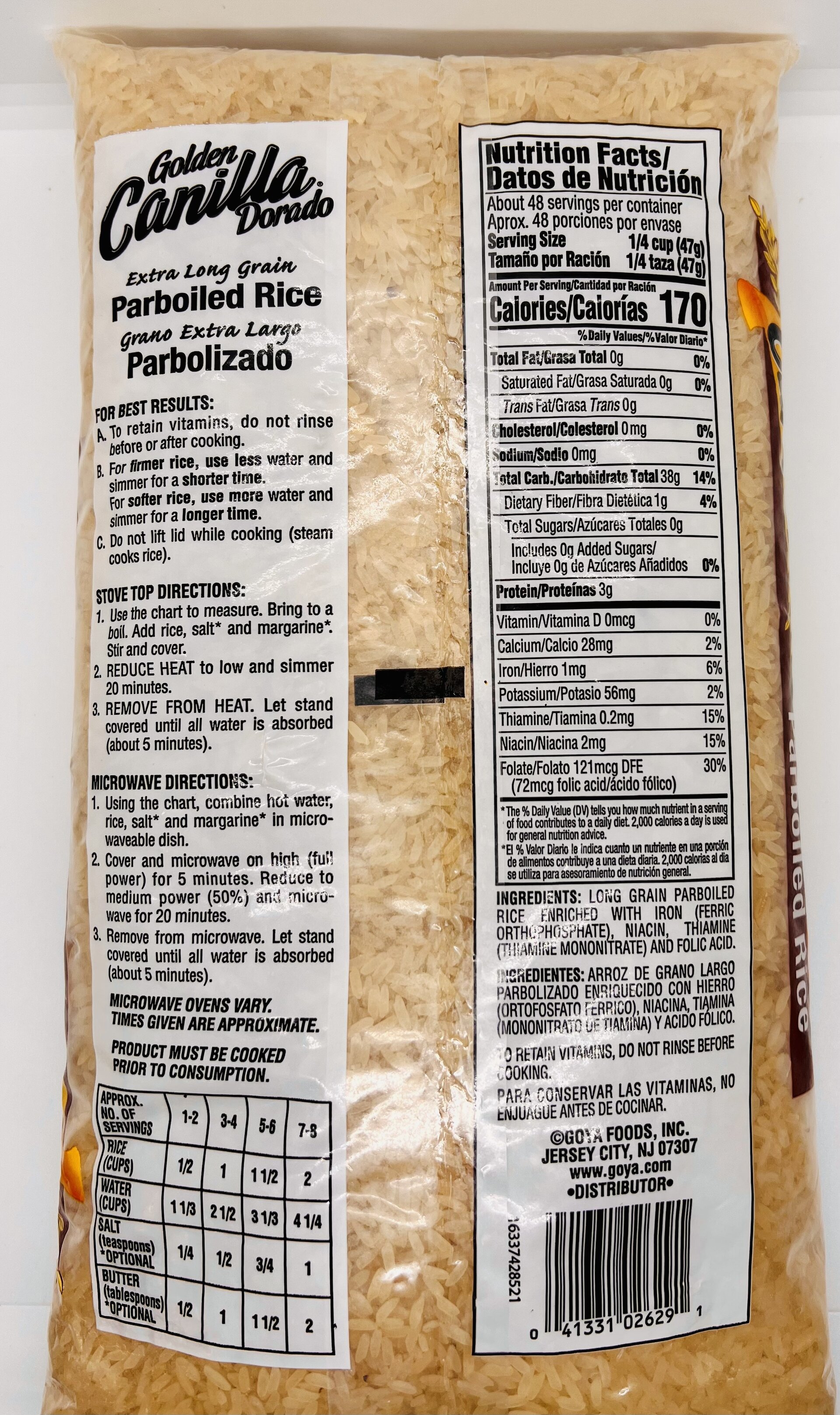 Long grain parboiled rice enriched with iron, niacin, thiamine and folic acid.