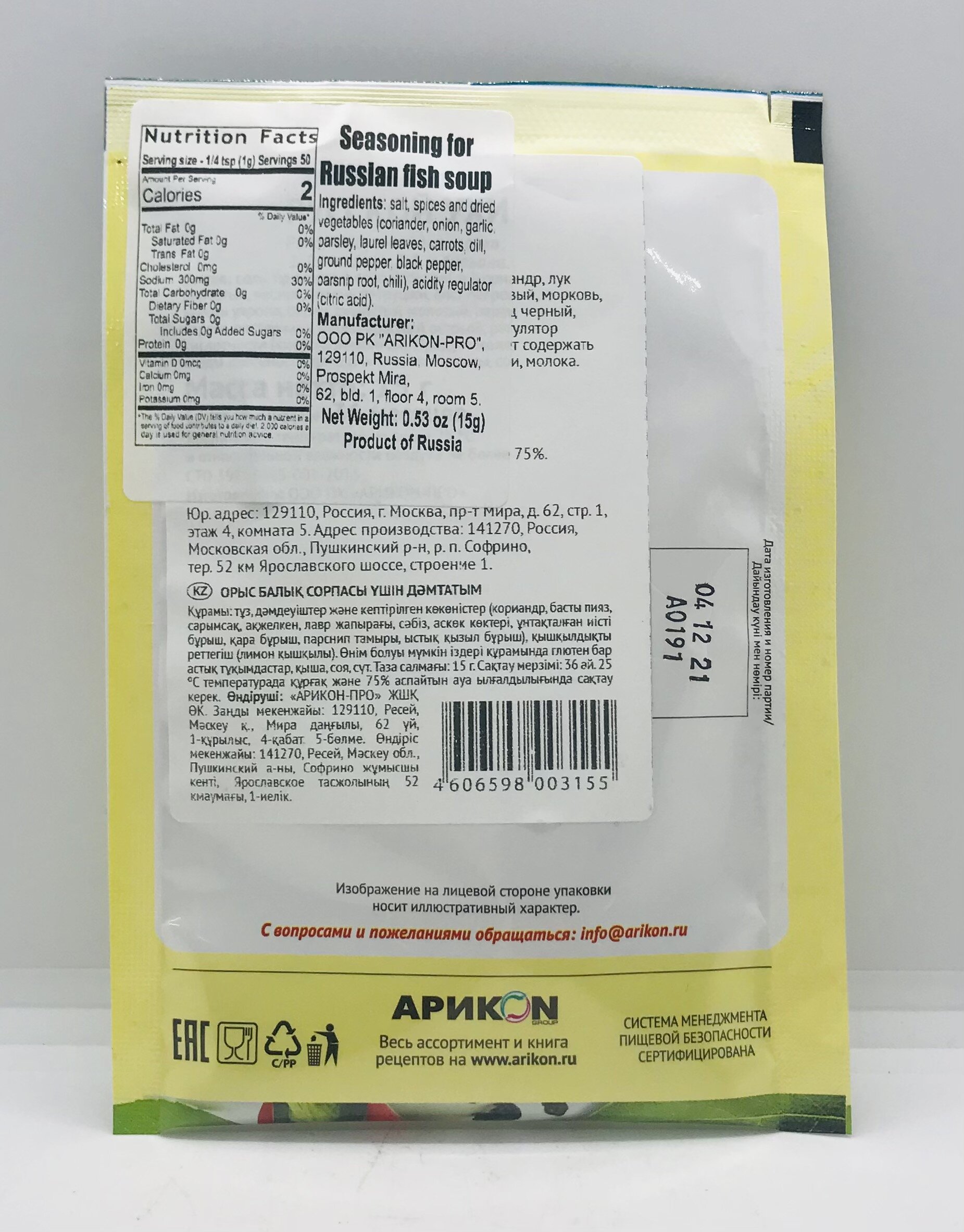 Salt, spices and dried vegetables (coriander, onion, garlic, parsley, laurel leaves, carrots, oil, ground pepper, black pepper, parsnip root, chili ), acidity regulator (citric acid).