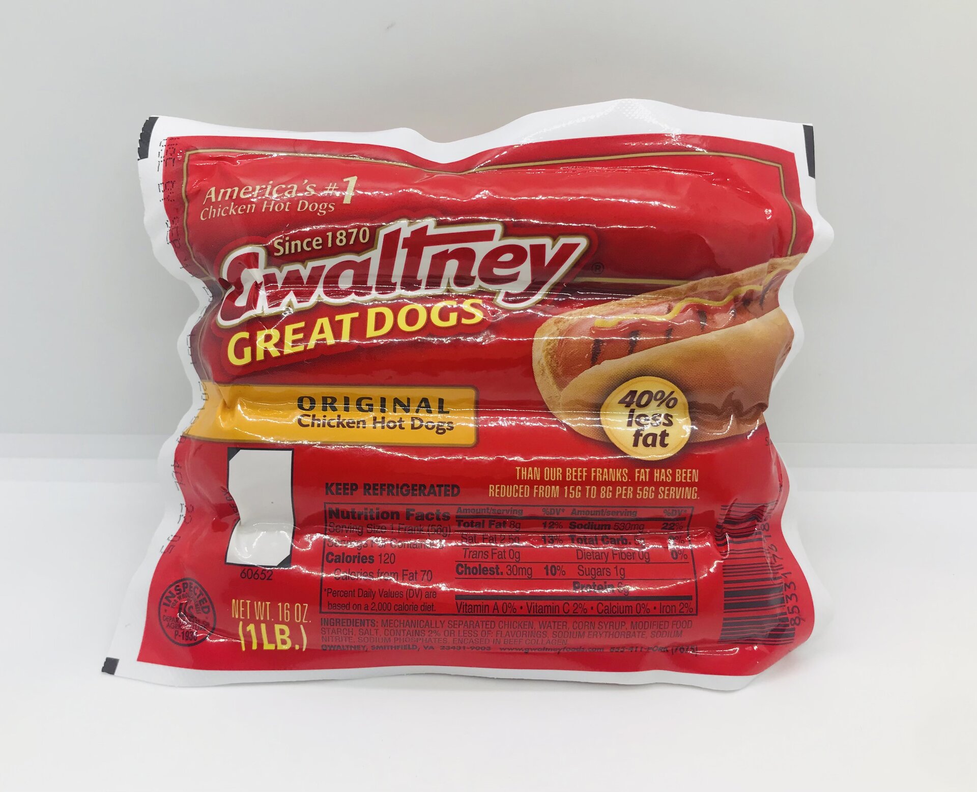 Mechanically separated chicken , water , corn syrup , modified food starch , salt, contains 2% or less OF: Flavorings, sodium , Erythorbate , sodium, nitrite , sodium , phosphates, encased in beef collagen.
