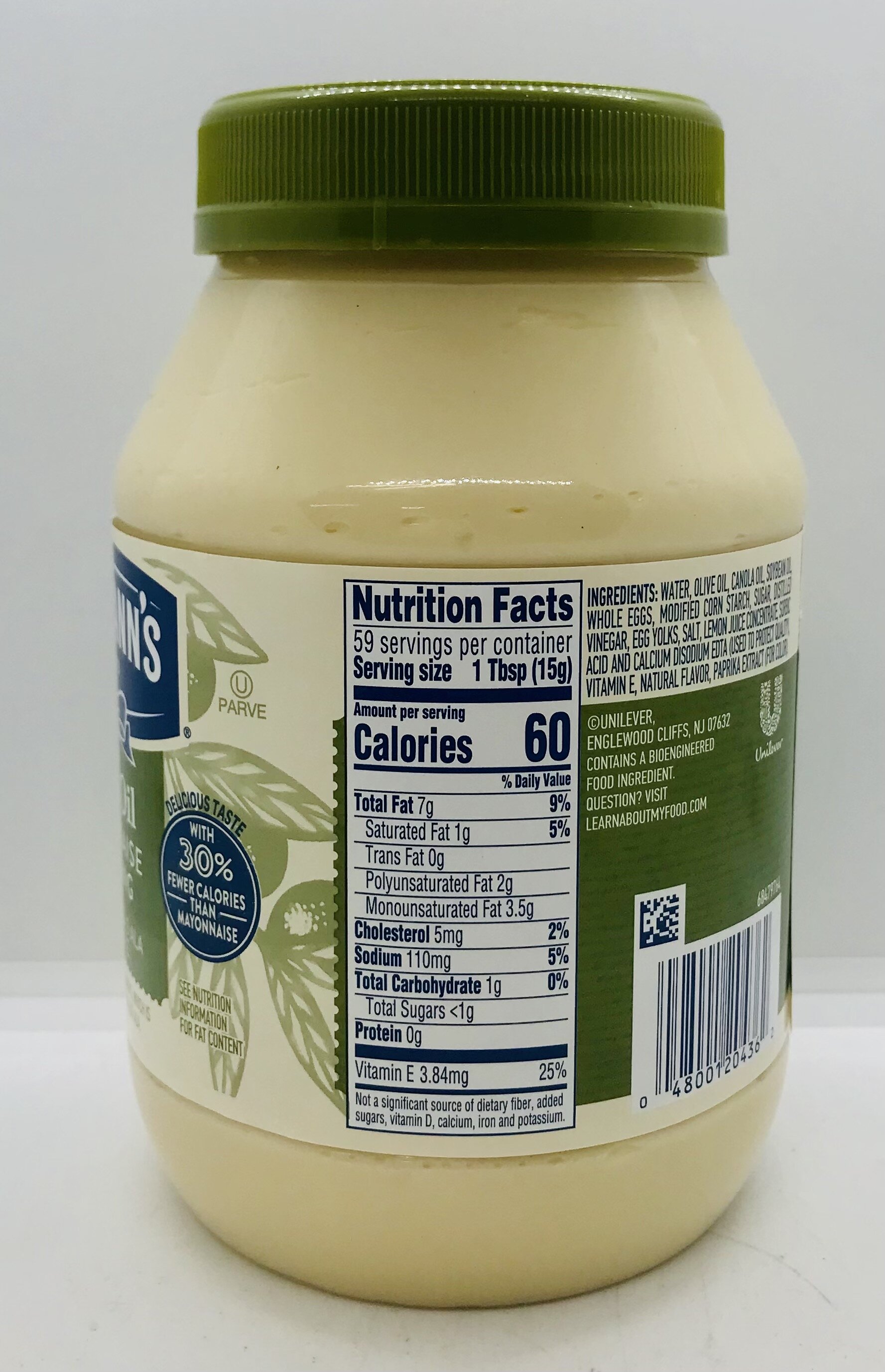 Water, olive oil, canola oil, soybean oil, whole eggs, modified corn starch, sugar, distilled vinegar, egg yolks, salt, lemon juice concentrate, sorbic acid and disodium edta, vitamin E, natural flavor, paprika extract.