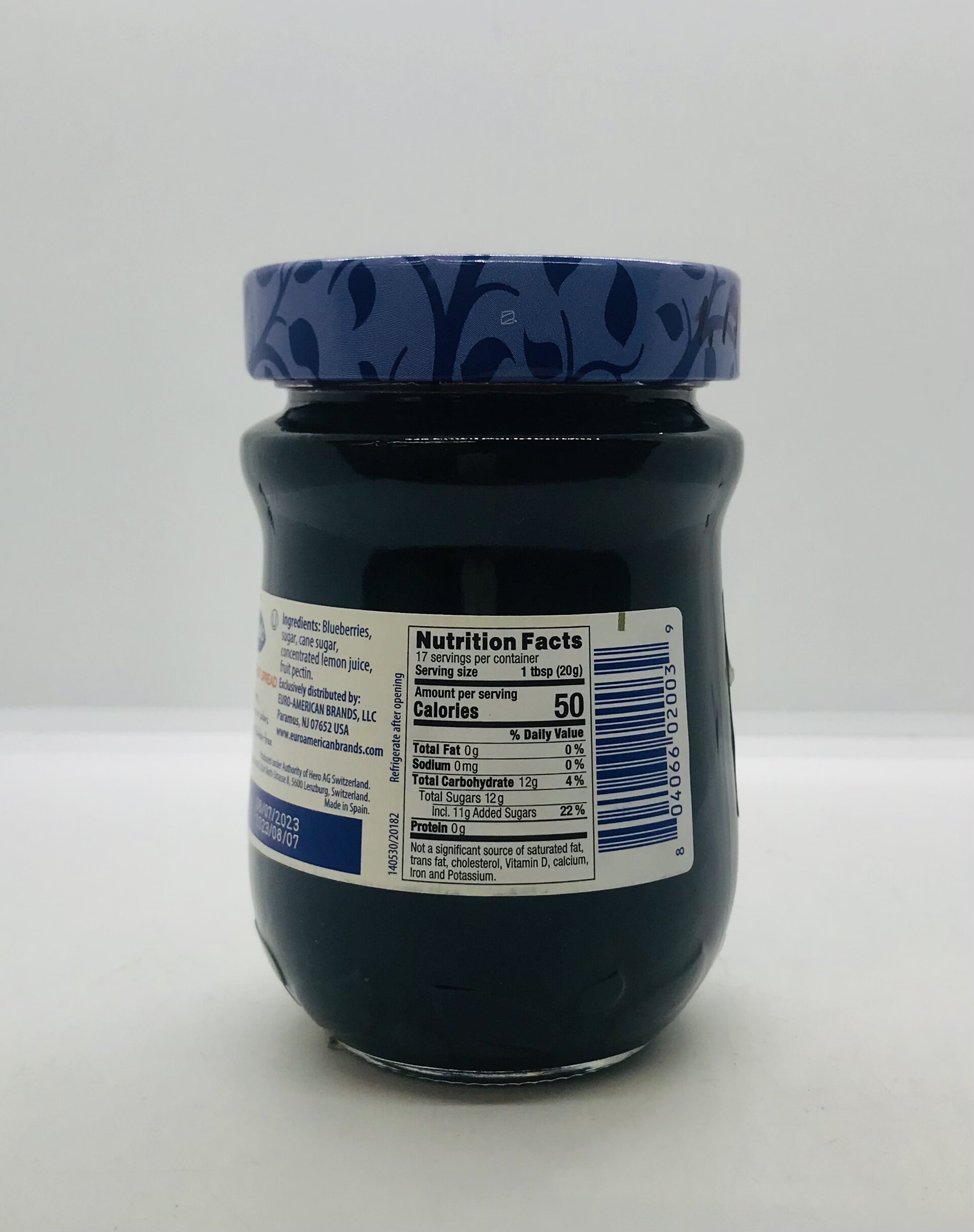 Blueberries, sugar, cane sugar, concentrated lemon juice, fruit pectin.