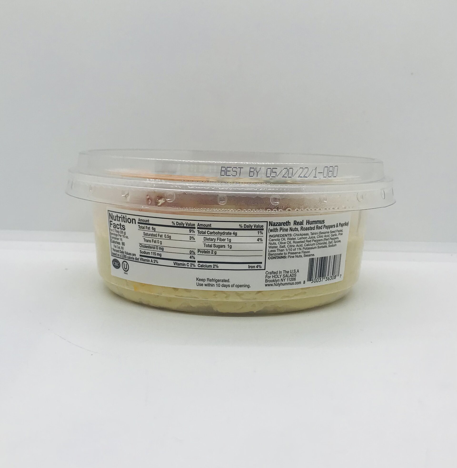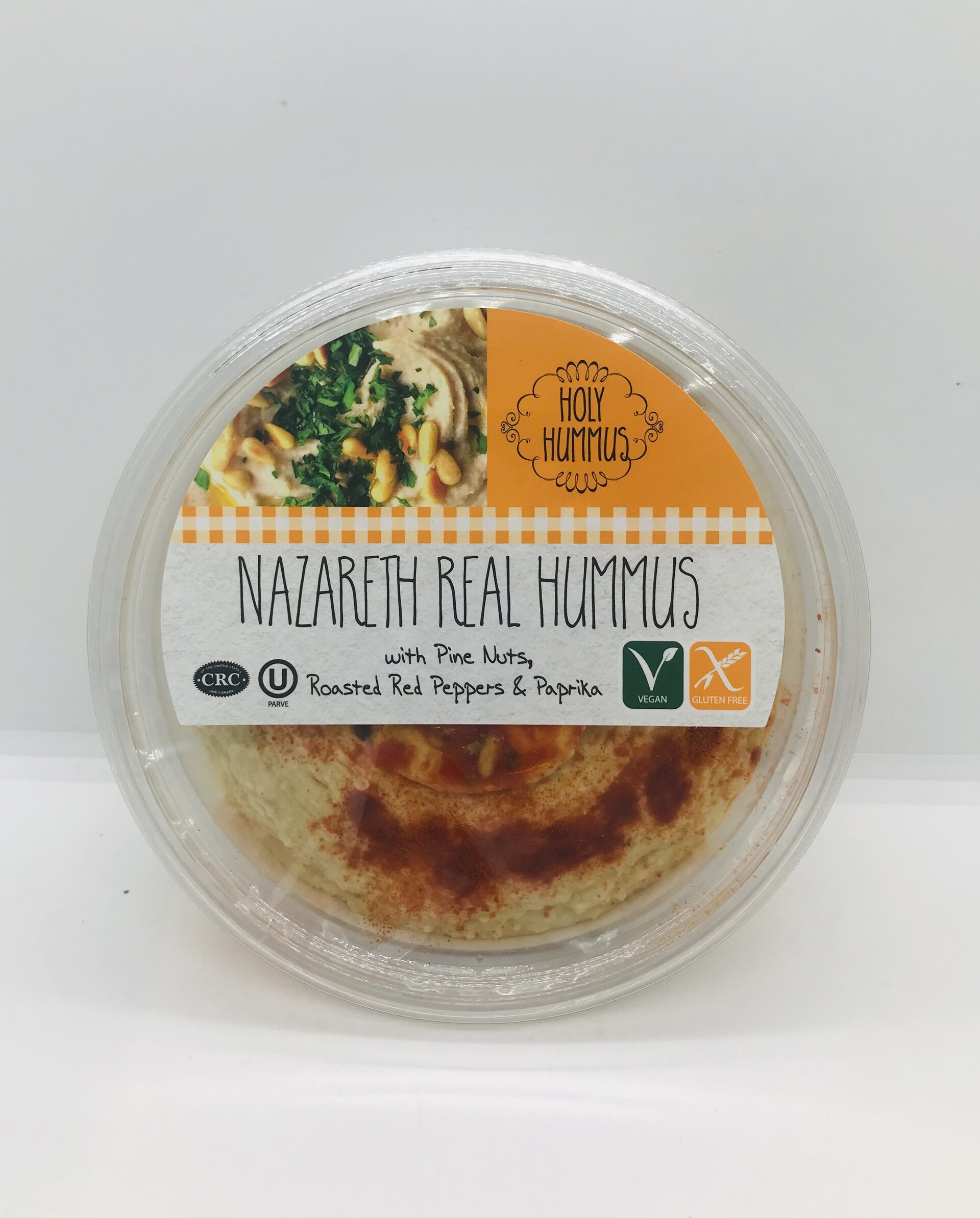 Chickpeas, Tahini (Sesame Seed Paste), Canola Oil, Water, Lemon Juice, Citric Acid, Garlic, Pine , nuts olive, water , roasted red peppers (red peppers, water , salt , citric acid, calcium, chloride), salt, spices, less than 1/10 of 1% potassium sorbate, sodium benzoate to preserve flavor.