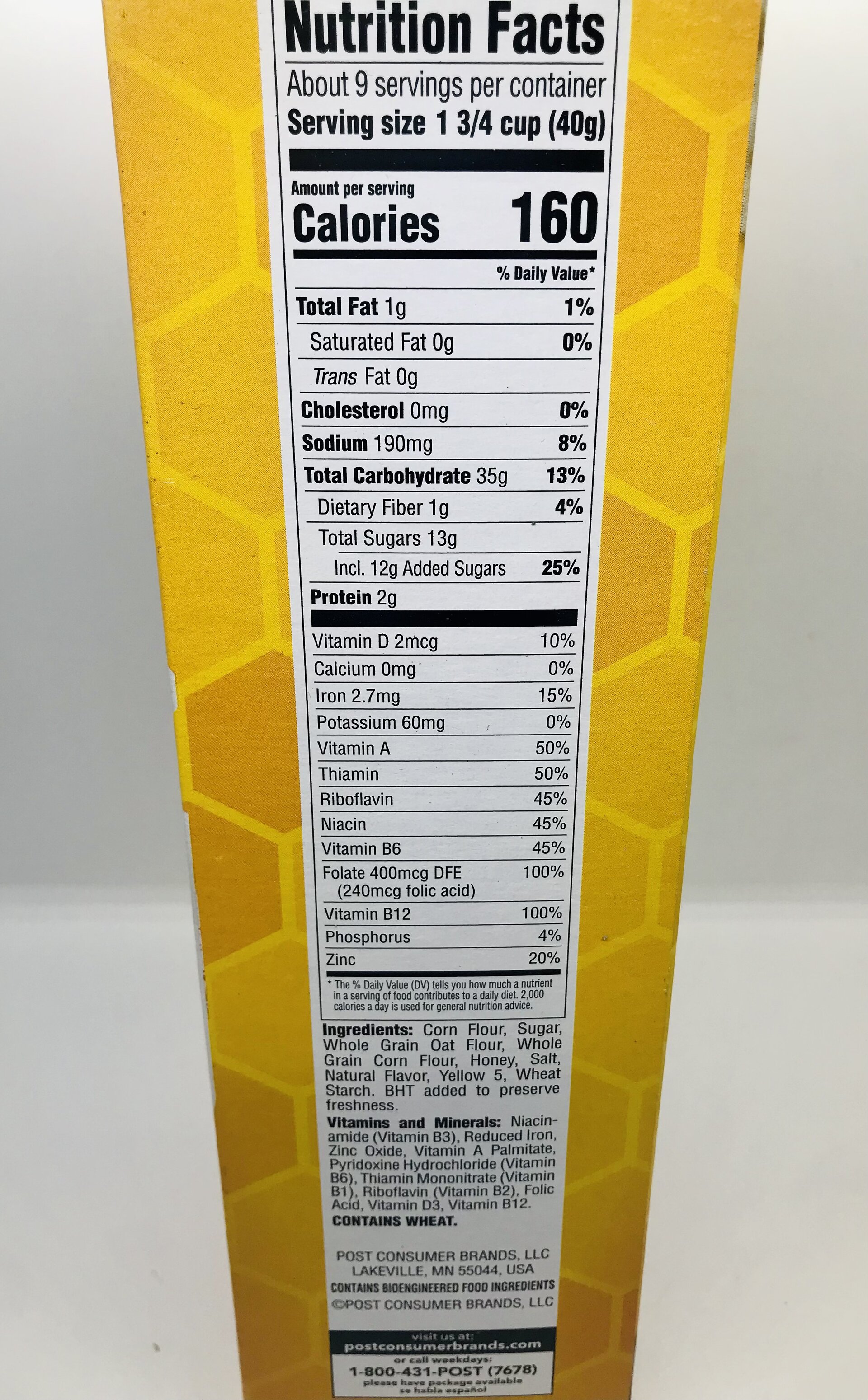 Corn flour, sugar, whole grain oat flour, whole grain corn flour, honey, salt, natural flavor, yellow 5, wheat starch.