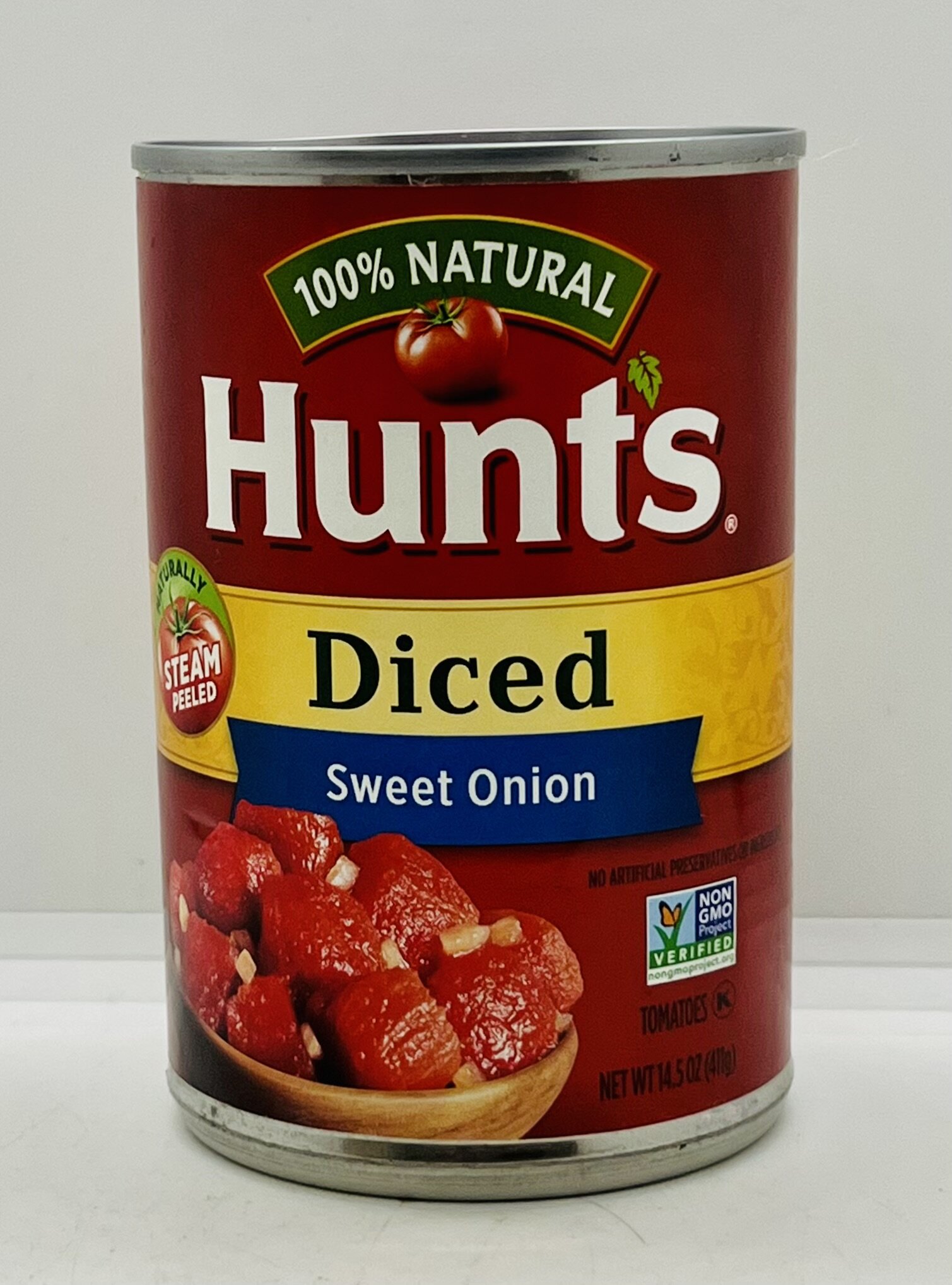 Diced tomatoes, tomato juice, less than 2% of: dried sweet onion, sugar, dried onion, salt, citric acid, calcium chloride, garlic powder.