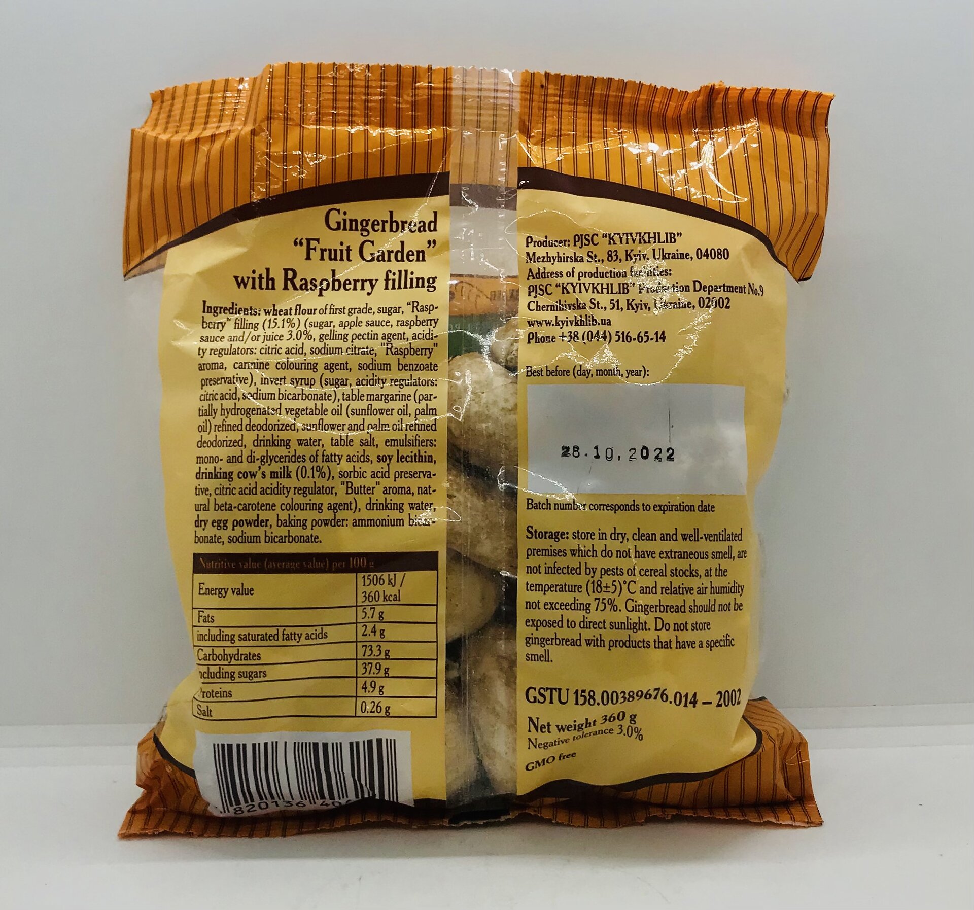wheat flour of first grade, sugar, "Rasp berry" filling (15.1%) (sugar, apple sauce, raspberry sauce and/or juice 3.0%, gelling pectin agent, acidity regulators: citric acid, sodium citrate, "Raspberry" aroma, carmine colouring agent, sodium benzoate preservative), invert syrup (sugar, acidity regulators: citric acid, sodium bicarbonate), table margarine (partially hydrogenated vegetable oil (sunflower oil, palm oil) refined deodorized, sunflower and palm oil refined deodorized, drinking water, table salt, emulsifiers: mono- and di-glycerides of fatty acids, soy lecithin, drinking cow's milk (0.1%), sorbic acid preservative, citric acid acidity regulator, "Butter" aroma, natural beta-carotene colouring agent), drinking water, dry egg powder, baking powder: ammonium bicarbonate, sodium bicarbonate.