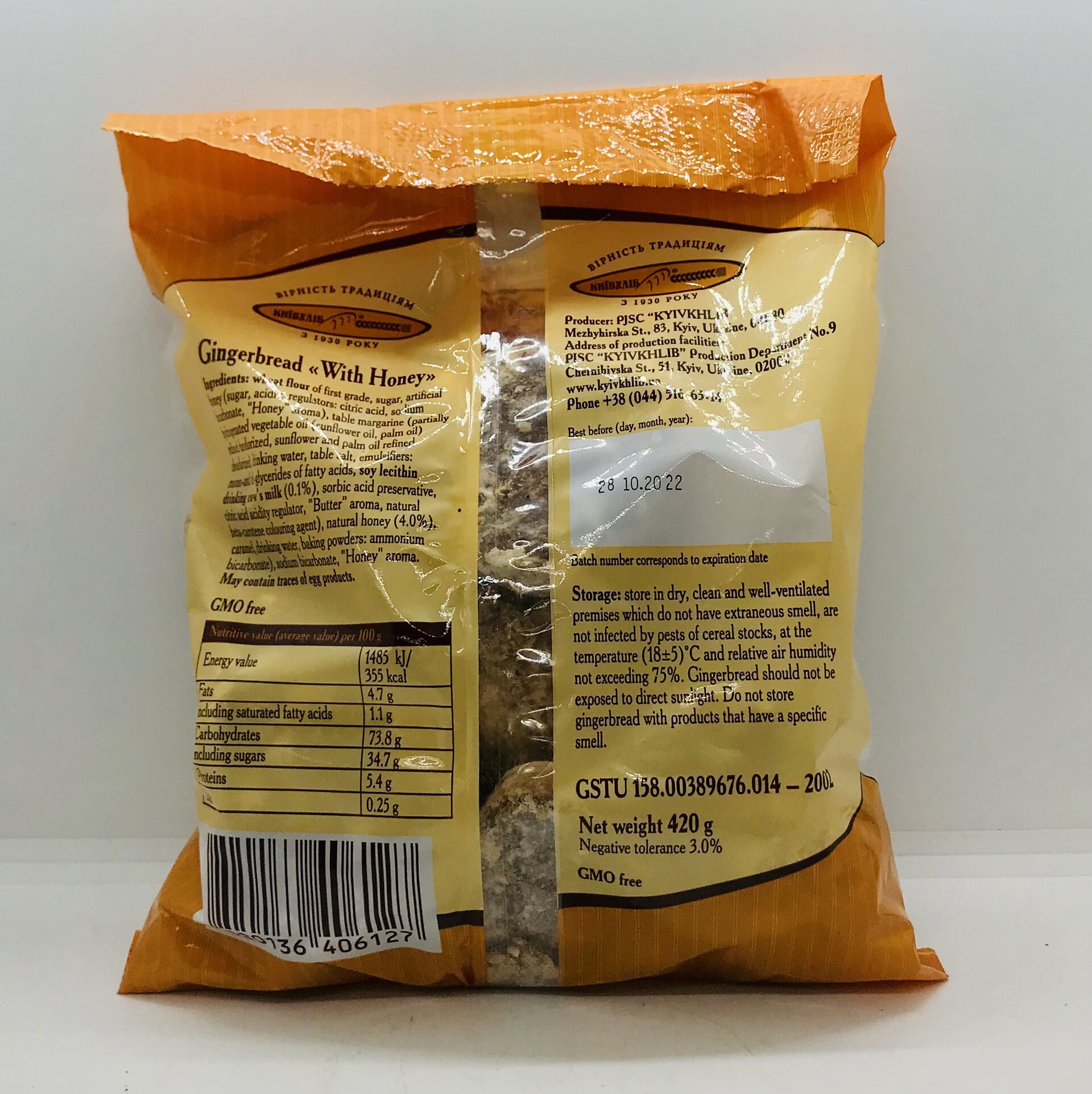 Wheat flour of first grade, sugar, artificial honey (sugar, acidity regulators: citric acid, sodium bicarbonate, "Honey" aroma), table margarine (partially hydrogenated vegetable oil (sunflower oil, palm oil) refined deodorized, sunflower and palm oil refined deodorized, drinking water, table salt, emulsifiers: mono-and di-glycerides of fatty acids, soy lecithin, drinking cow's milk (0.1%), sorbic acid preservative, citric acid acidity regulator, "Butter" aroma, natural beta-carotene colouring agent), natural honey (4.0%), caramel, drinking water, baking powders: ammonium bicarbonate), sodium bicarbonate, "Honey" aroma.