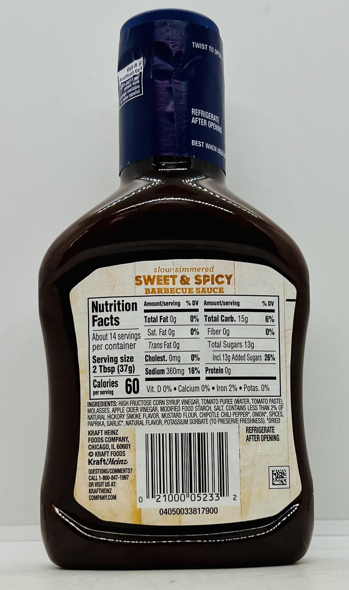HIGH FRUCTOSE CORN SYRUP, VINEGAR, TOMATO PUREE (WATER, TOMATO PASTE) MOLASSES, APPLE CIDER VINEGAR, MODIFIED FOOD STARCH, SALT, CONTAINS LESS THAN 2% OF NATURAL HICKORY SMOKE FLAVOR, MUSTARD FLOUR, CHIPOTLE CHILI PEPPER", ONION, SPICES, PAPRIKA, GARLIC, NATURAL FLAVOR, POTASSIUM SORBATE (TO PRESERVE FRESHNESS).