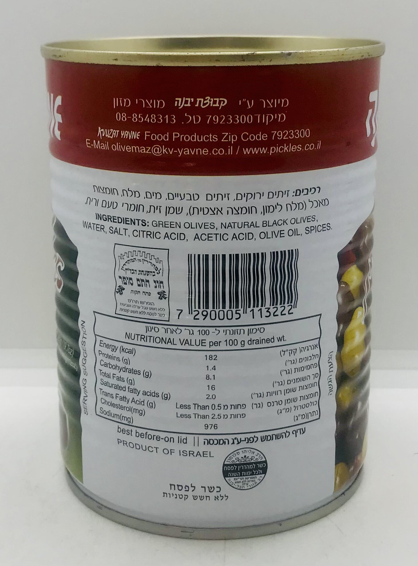 Green olives, natural black olives, water, salt, citric acid, acetic acid, olive oil, spices.