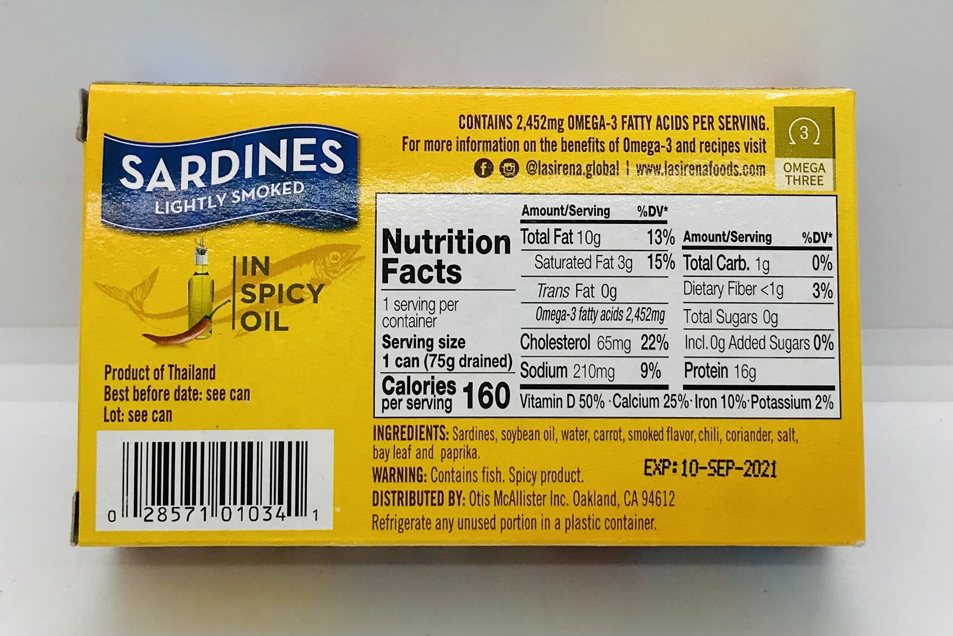 Sardines, soybean oil, water, carrot, smoked flavor, chili, coriander, salt, bay leaf and paprika.