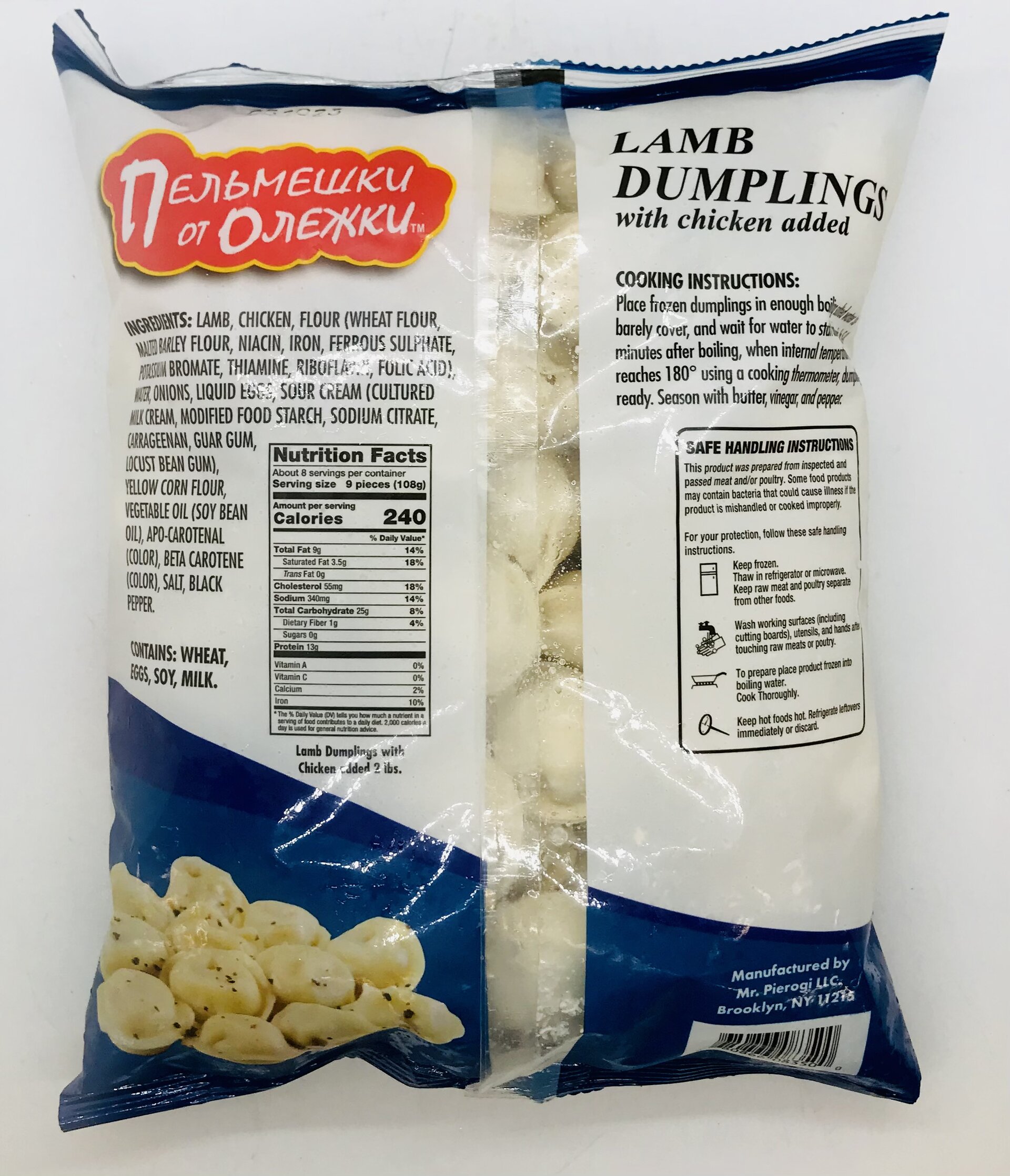 LAMB, CHICKEN, FLOUR (WHEAT FLOUR, MALTED BARLEY FLOUR, NIACIN, IRON, FERROUS SULPHATE, POTASSIUM BROMATE, THIAMINE, RIBOFLAVIN, FOLIC AC WATER ONIONS, LIQUID EGGS, SOUR CREAM (CULTURED MILK CREAM, MODIFIED FOOD STARCH, SODIUM CITRATE, CARRAGEENAN, GUAR GUM, LOCUST BEAN GUM), YELLOW CORN FLOUR, VEGETABLE OIL (SOY BEAN OIL), APO-CAROTENAL (COLOR), BETA CAKOTENE (COLOR), SALT, BLACK PEPPER.
