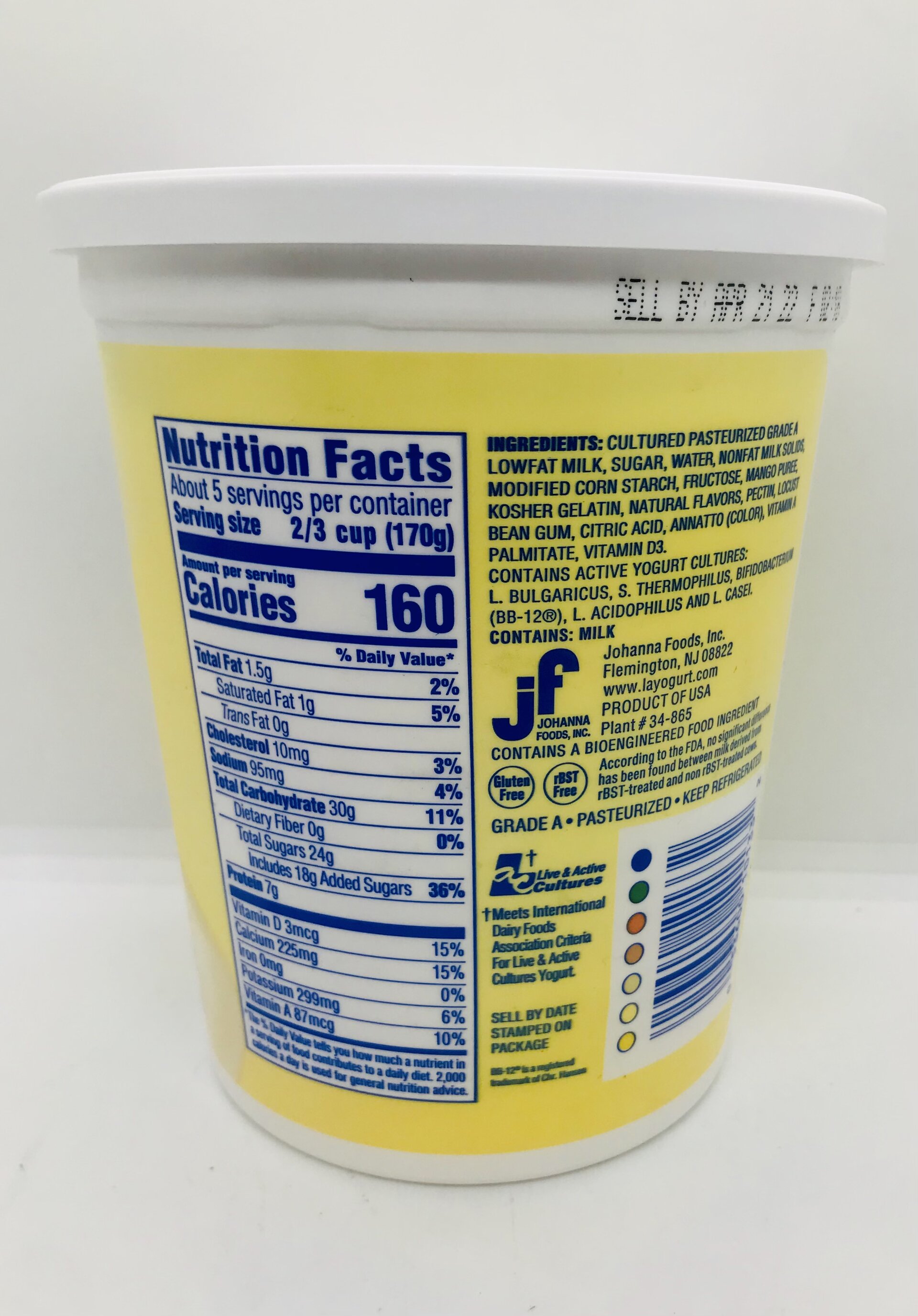 Cultured pasteurized grade A lowfat milk, sugar, water, nonfat milk solids, modified corn starch, fructose, mango puree, kosher gelatin, natural flavors, pectin, locust bean gum, citric acid, Annatto, vitamin A palmitate, Vitamin D3