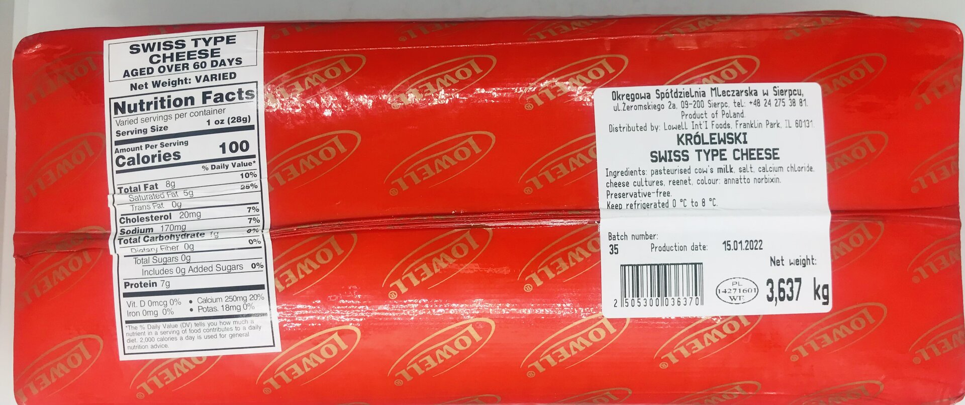 Pasteurized cow's milk, salt, calcium chloride, cheese cultures, rennet, Color: annatto norbixin.