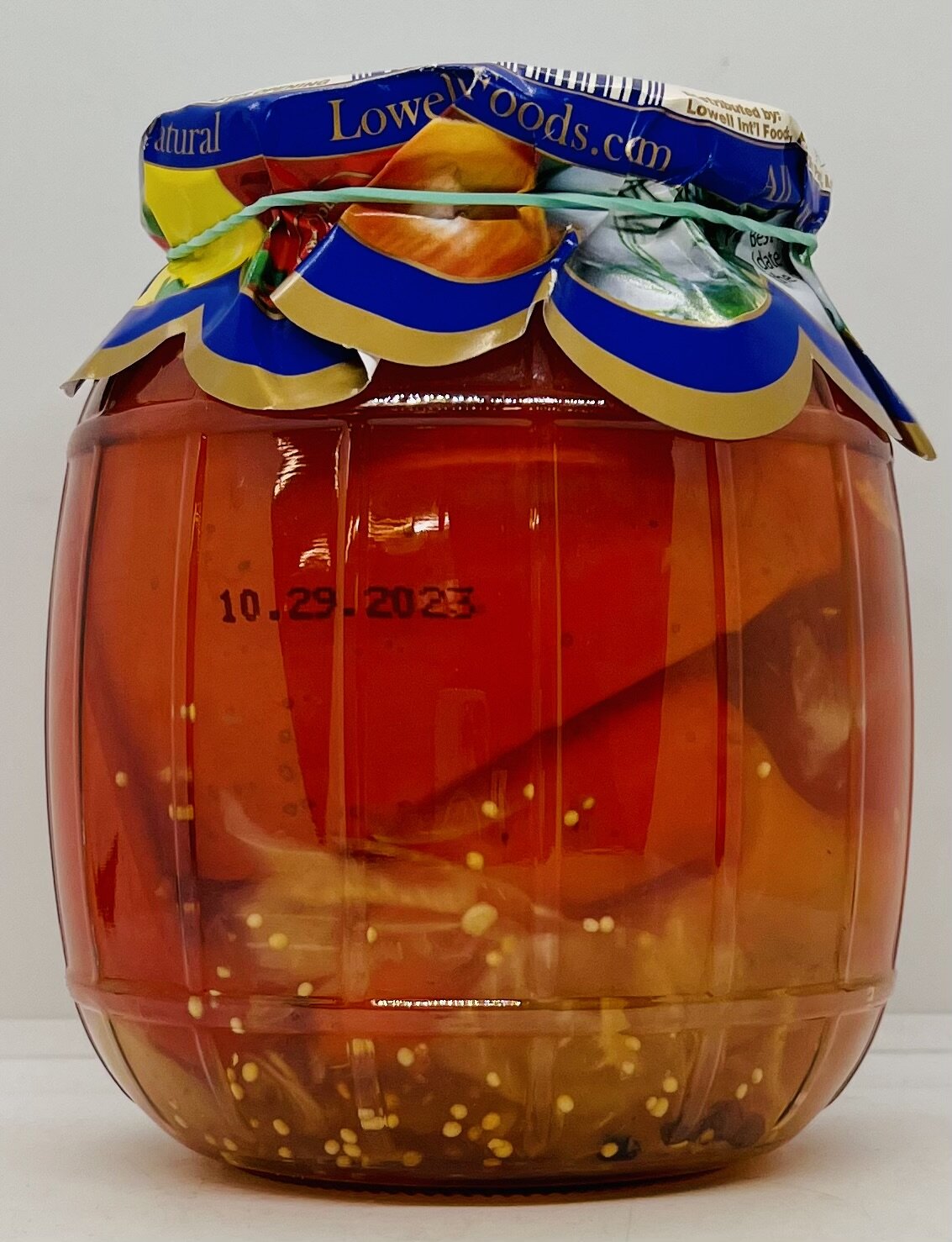 Red pepper, water, vinegar, sugar, salt, onion, mustard seeds, allspice, pepper, bay leaf.