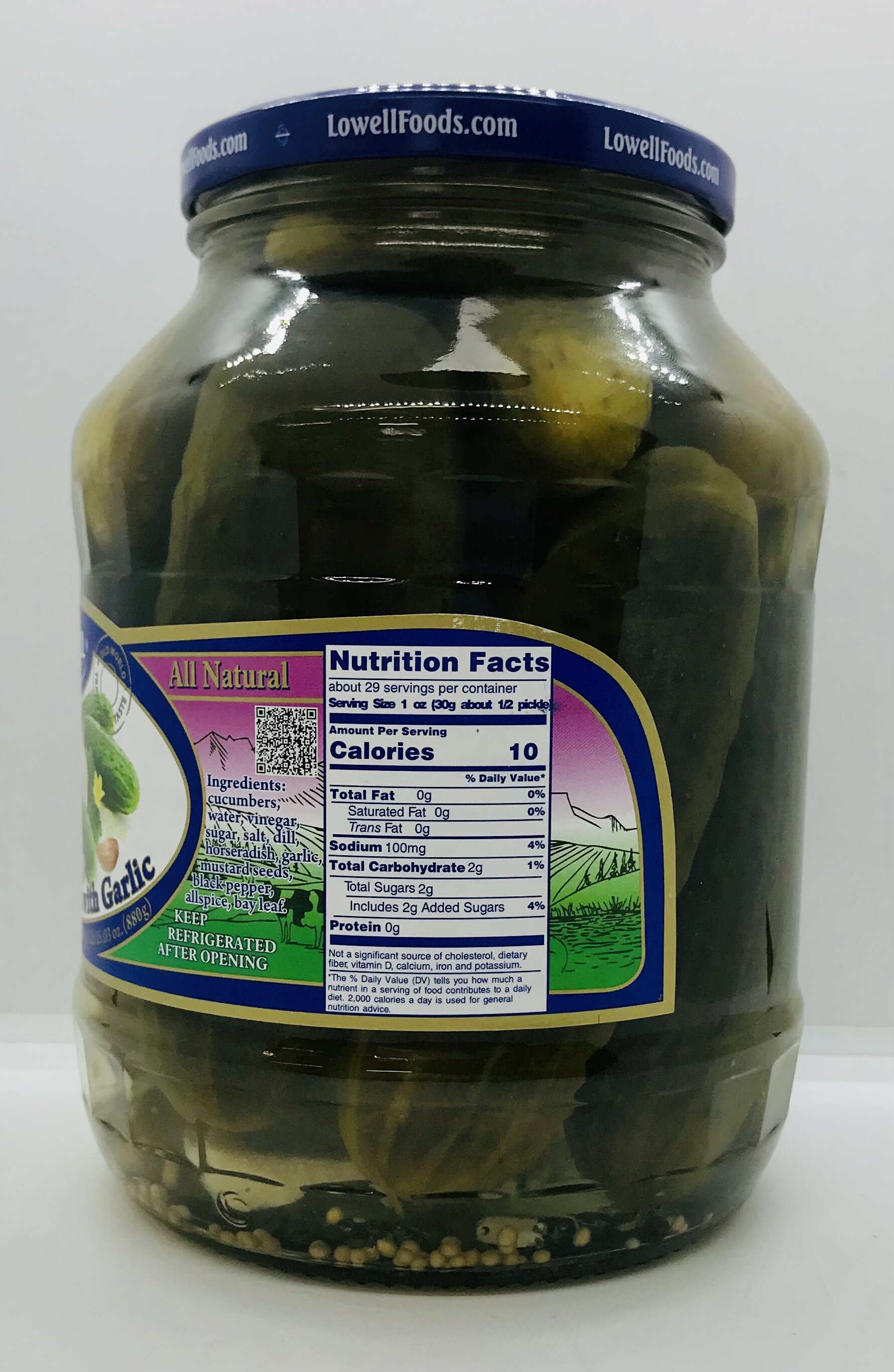 Cucumbers, water, vinegar, sugar, salt, dill, horseradish, garlic, mustard seeds, black pepper, allspice, bay leaf.