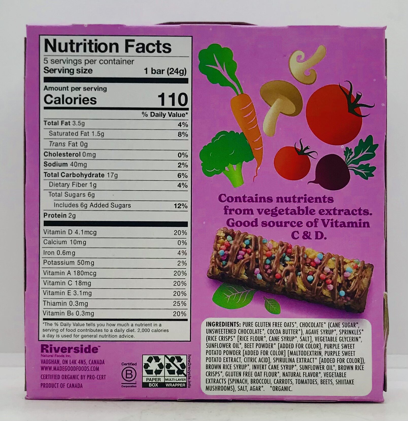 PURE GLUTEN FREE OATS*, CHOCOLATE* (CANE SUGAR*, UNSWEETENED CHOCOLATE*, COCOA BUTTER*), AGAVE SYRUP*, SPRINKLES* (RICE CRISPS [RICE FLOUR*, CANE SYRUP*, SALT], VEGETABLE GLYCERIN*, SUNFLOWER OIL*, BEET POWDER* [ADDED FOR COLOR], PURPLE SWEET POTATO POWDER [ADDED FOR COLOR] [MALTODEXTRIN, PURPLE SWEET POTATO EXTRACT, CITRIC ACID], SPIRULINA EXTRACT* [ADDED FOR COLOR]), BROWN RICE SYRUP, INVERT CANE SYRUP, SUNFLOWER OIL*, BROWN RICE CRISPS, GLUTEN FREE OAT FLOUR*, NATURAL FLAVOR, VEGETABLE EXTRACTS (SPINACH, BROCCOLI, CARROTS, TOMATOES, BEETS, SHIITAKE MUSHROOMS), SALT, AGAR*. *ORGANIC.