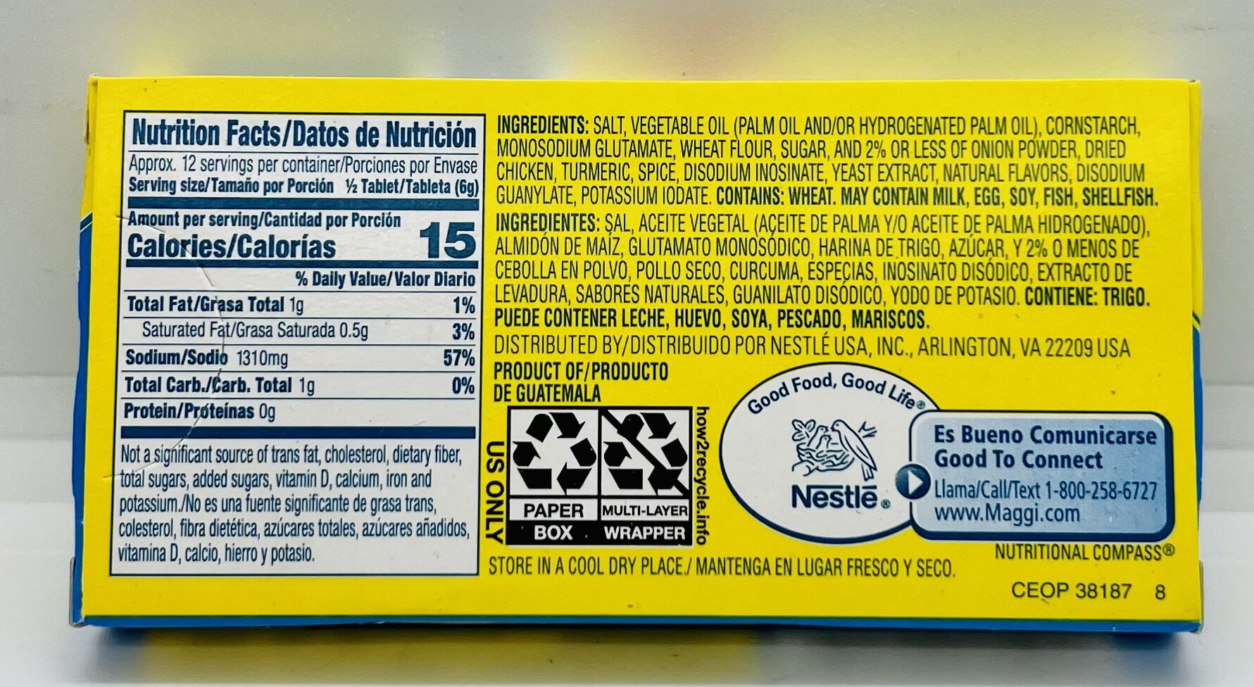 SALT, VEGETABLE OIL (PALM OIL AND/OR HYDROGENATED PALM OIL), CORNSTARCH, MONOSODIUM GLUTAMATE, WHEAT FLOUR, SUGAR, AND 2% OR LESS OF ONION POWDER, DRIED CHICKEN, TURMERIC, SPICE, DISODIUM INOSINATE, YEAST EXTRACT, NATURAL FLAVORS, DISODIUM GUANYLATE, POTASSIUM IODATE.