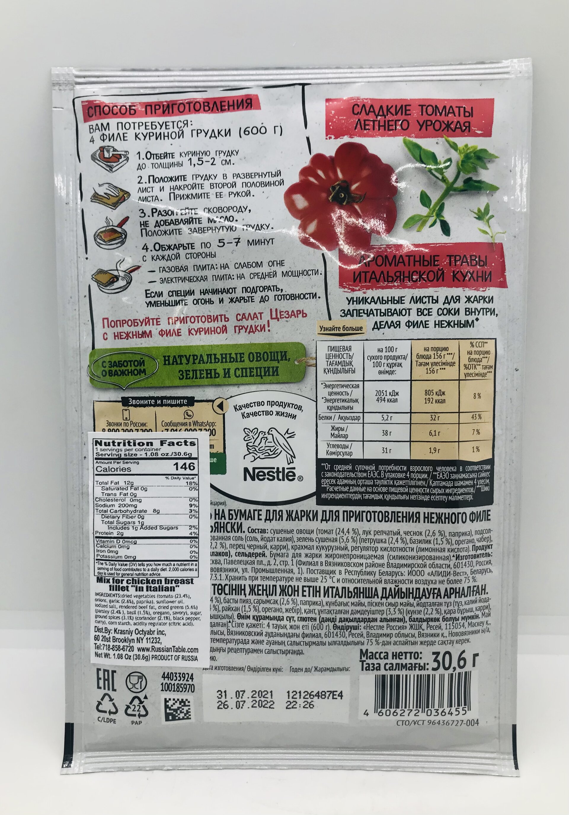 Dried vegetables (tomato (23.4%), onions, garlic (2.6%), paprika), sunflower oil. iodized salt, rendered beef fat, dried greens (5.6%) (parsley (2.4%), basil (1.5%), oregano, savory), sugar, ground spices (3.1%) (coriander (2.1%), black pepper, curry), com starch, acidity regulator (citric acid).