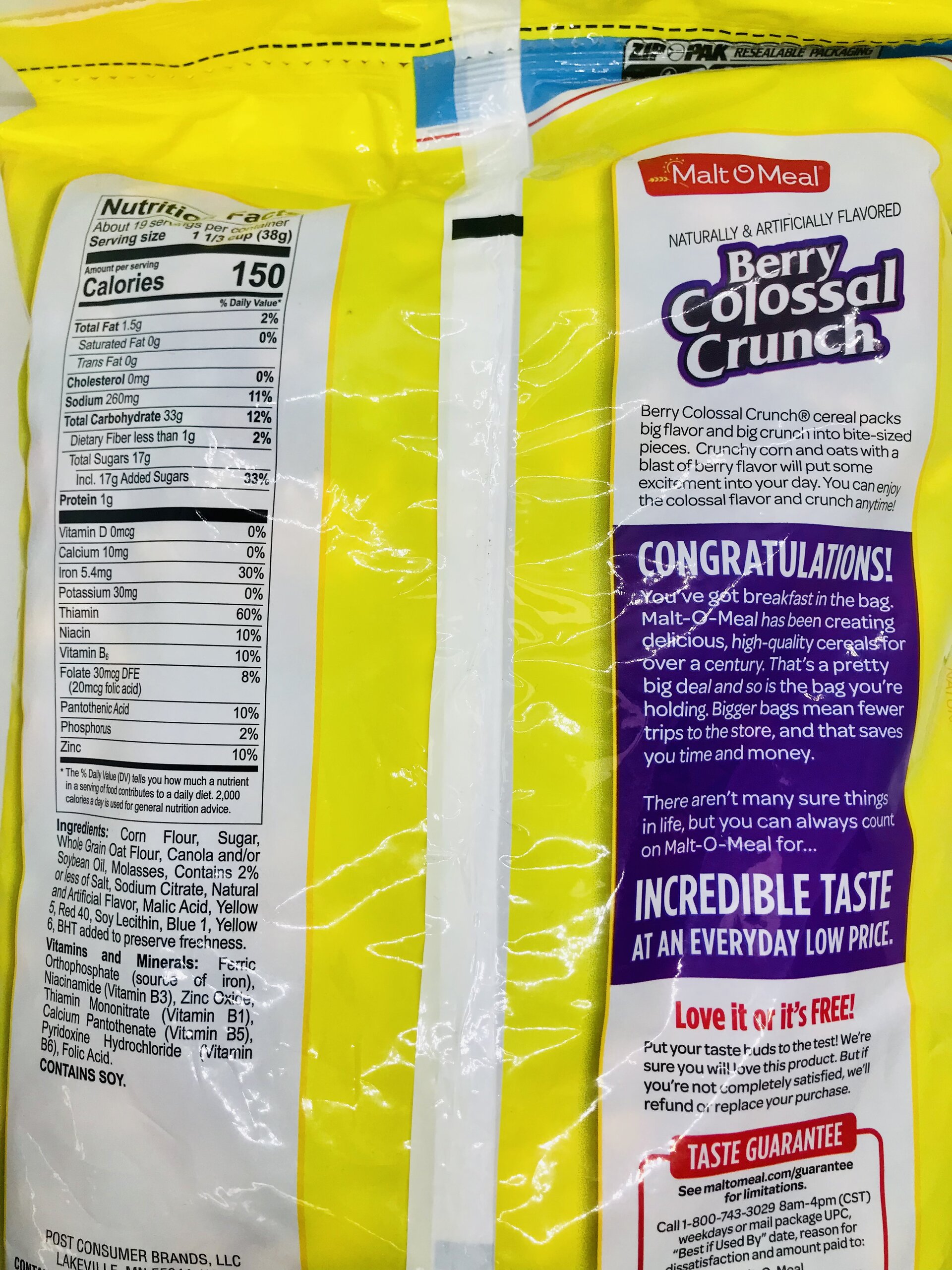 Corn flour, sugar, Whole grain oat flour, Canola and/or soybean oil, molasses, contains 2% or less of salt, sodium citrate, natural and artificial flavor, malic acid, yellow 5, red 40, soy lecithin, blue 1, yellow 6, BHT added to preserve freshness.