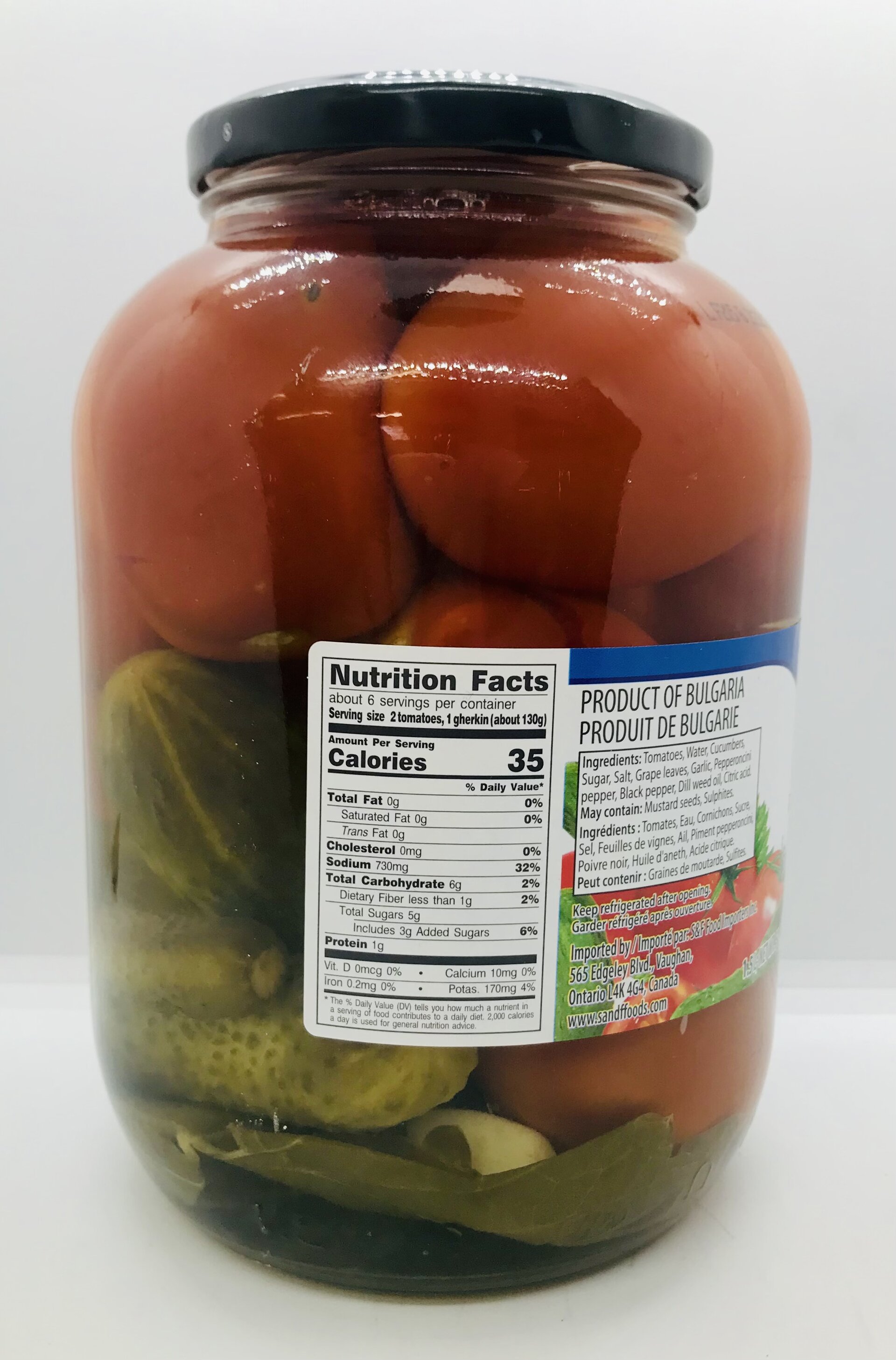 Tomatoes, water, cucumbers, sugar, salt, grape leaves, garlic, pepperoncini pepper, black pepper, dill weed oil, citric acid.