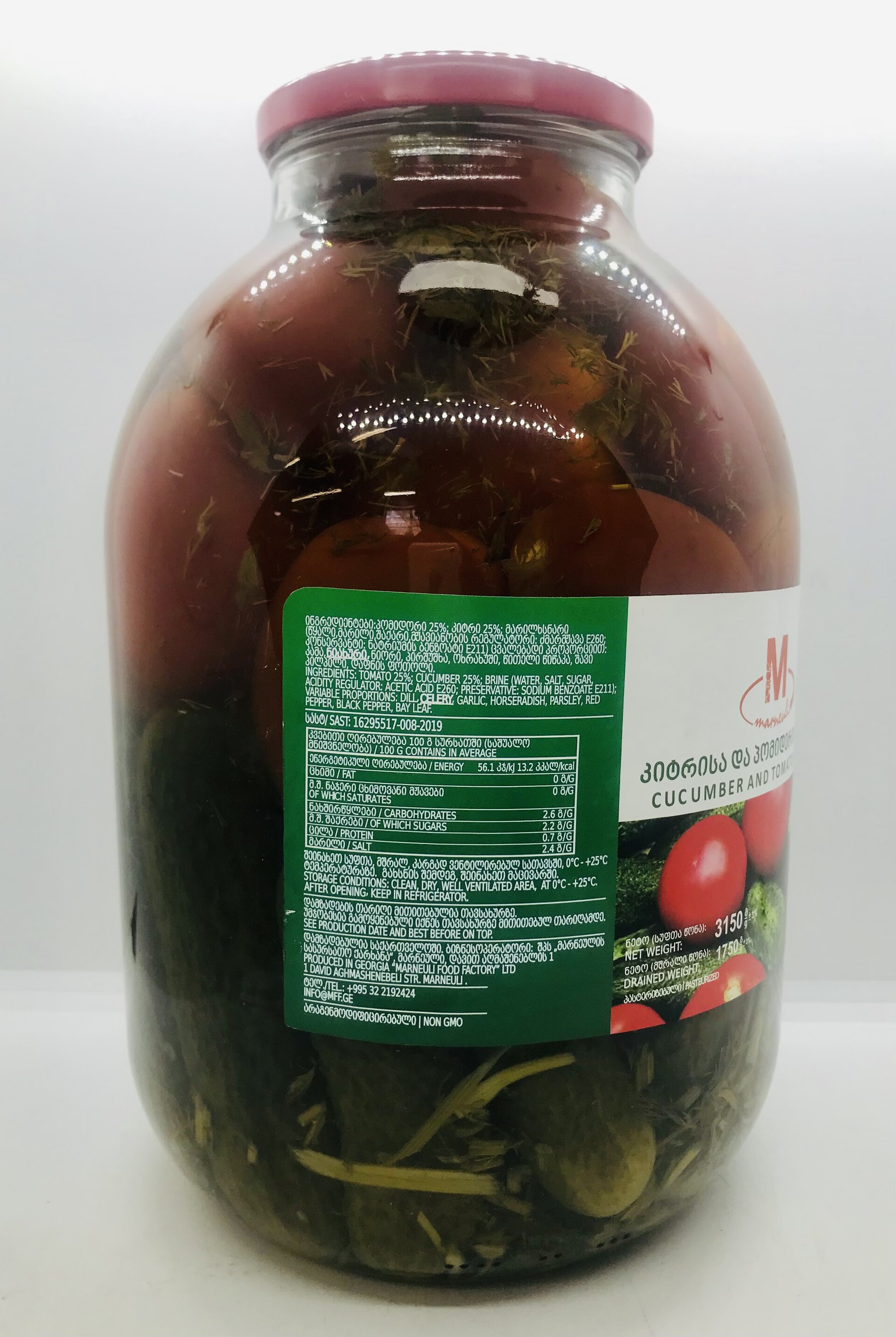 Tomato 25%, cucumber 25%, brine (water, salt, sugar, acidity regulator: acetic acid: preservative: sodium benzoate); variable proportions: dill, celery, garlic, horseradish, parsley, red pepper, black pepper, bay leaf.