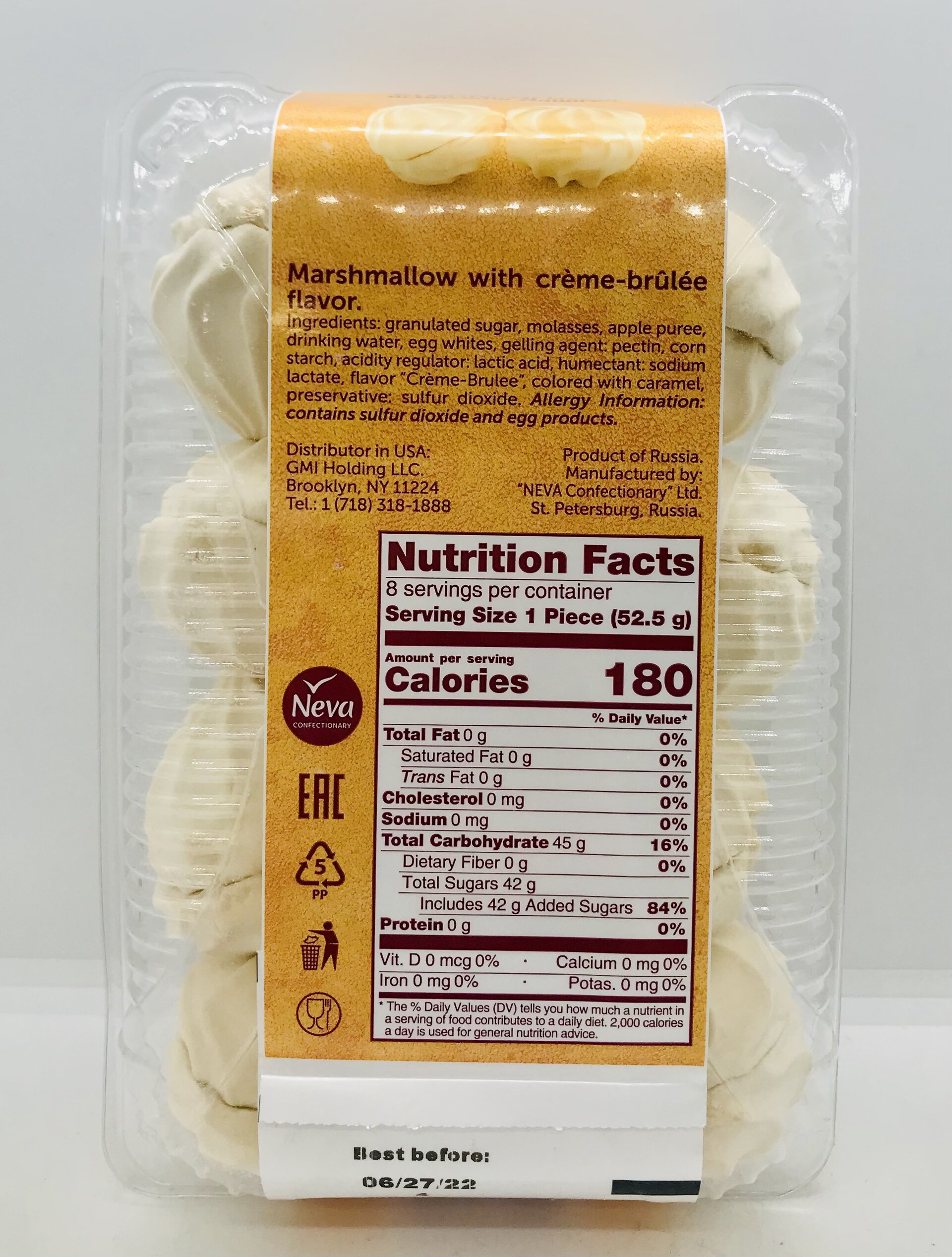 Granulated sugar, molasses, apple puree, drinking water, egg whites, gelling agent pectin, corn starch, acidity regulator: lactic acid, humectant: sodium lactate, flavor Crème-Brulee, colored with caramel, preservative: sulfur dioxide.