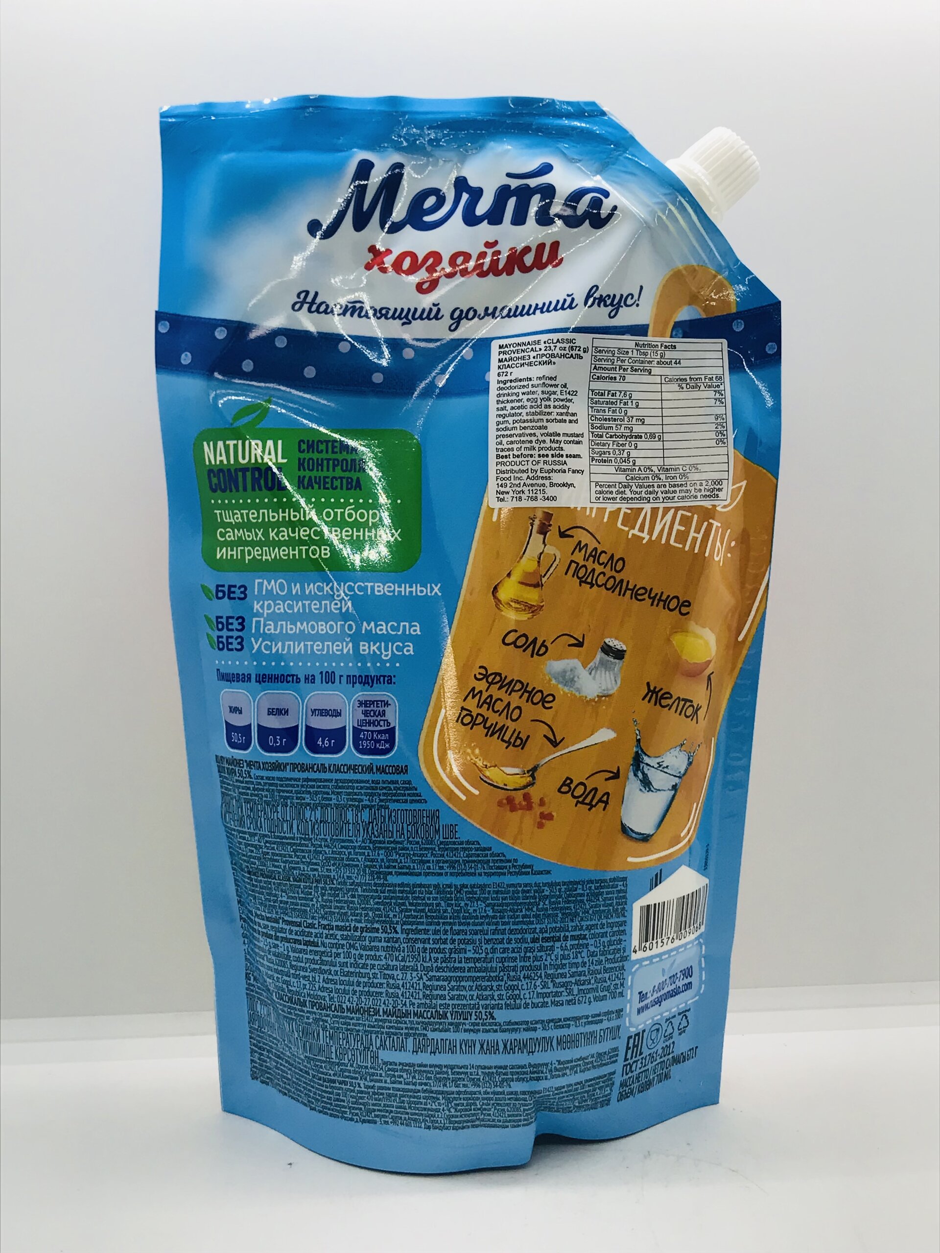 Refined deodorized sunflower oil, drinking water, sugar, E1422 thickener, egg yolk powder, salt, acetic acid as acidity regulator, stabilizer: xanthan gum, potassium sorbate and sodium benzoate preservatives, volatile mustard oil, carotene dye. May contain traces of milk products. Best before: see side seam. PRODUCT OF RUSSIA
