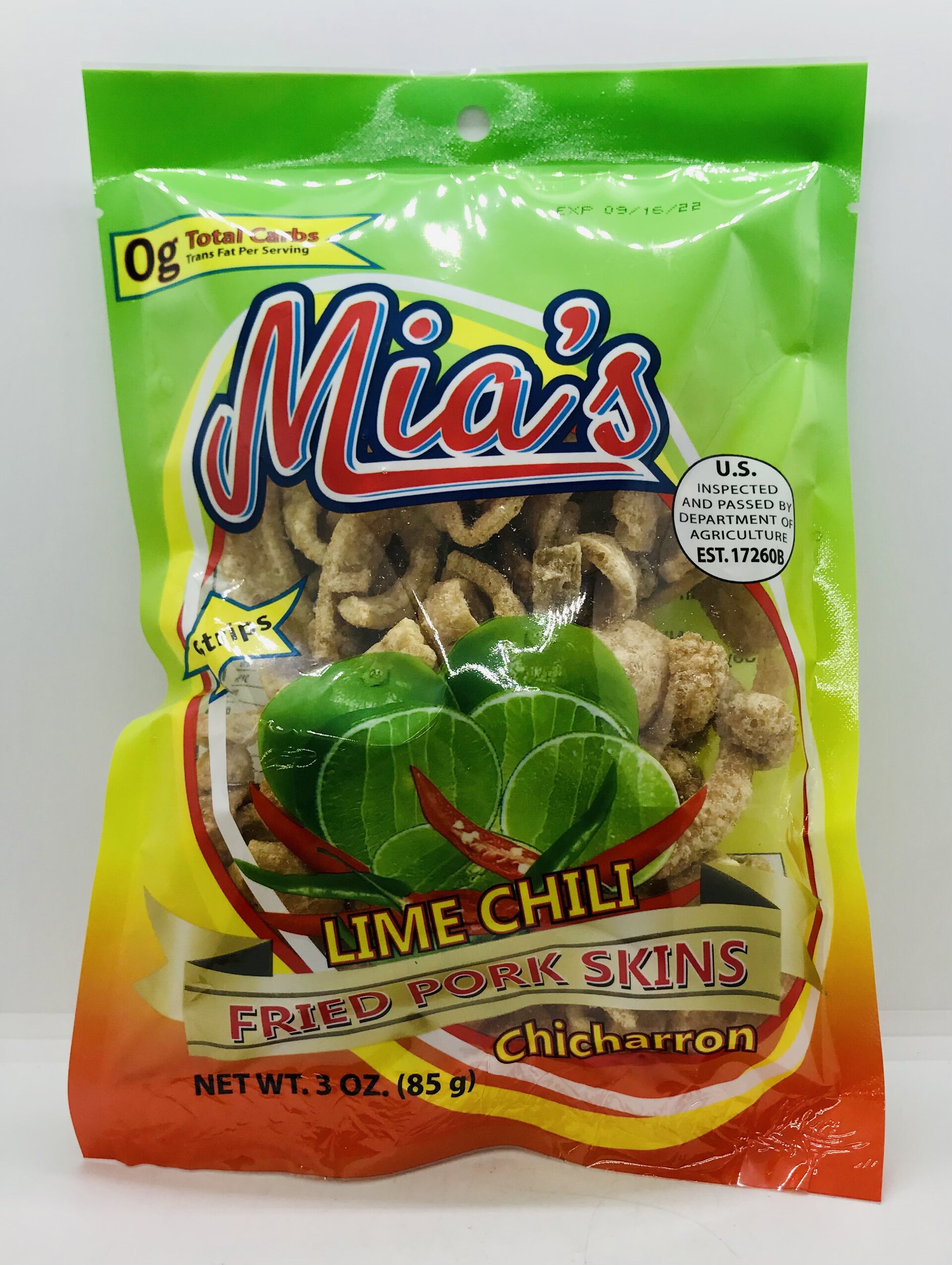 Pork Skins, Salt, Monosodium Glutamate, Seasonings (Non-dairy cream, Salt, Sugar, Hydrolyzed soy protein, Spice mix (Lemongrass, Kaffir lime leave powder, Red hot chili), Citric acid, Monosodium glutamate, Lime flavor (Lime oil (Essential oil), Citra fresh), Disodium guanylate, Disodium inosinate), Spicy Seasoning (salt, paprika & spices, dextrose, hydrolyzed corn & soy proteins, corn starch, sugar, garlic, extractives of paprika & annatto. Less than 2% calcium silicate added to prevent caking) Soybean oil or Canola oil.