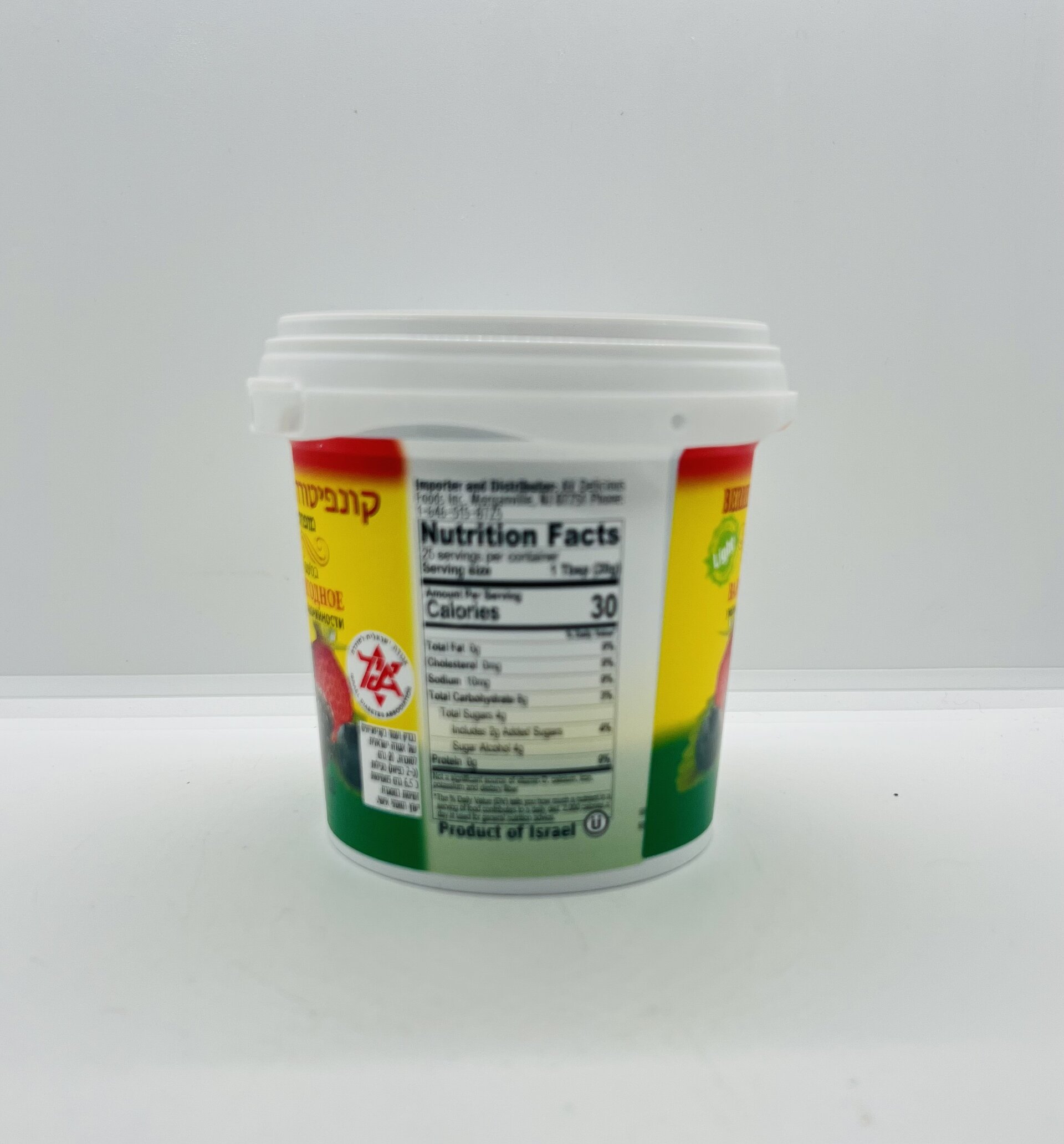 Berries (48%) (Strawberry, black currant, cranberry, cherry) sweeteners (sorbitol, maltitol, sucralose), fructose, stabilizers (pectin, 'locust bean gum), acidity regulators (citric acid, trisodium citrate), preservative (potassium phosphate). גרם MAY CONTAIN TRACES of TREE NUTS, PEANUTS, SOY, WHEAT and SESAME. Store in a cool and dry place, keep refrigerated after opening! MAY CONTAIN PITS! Best before date indicated on top of the