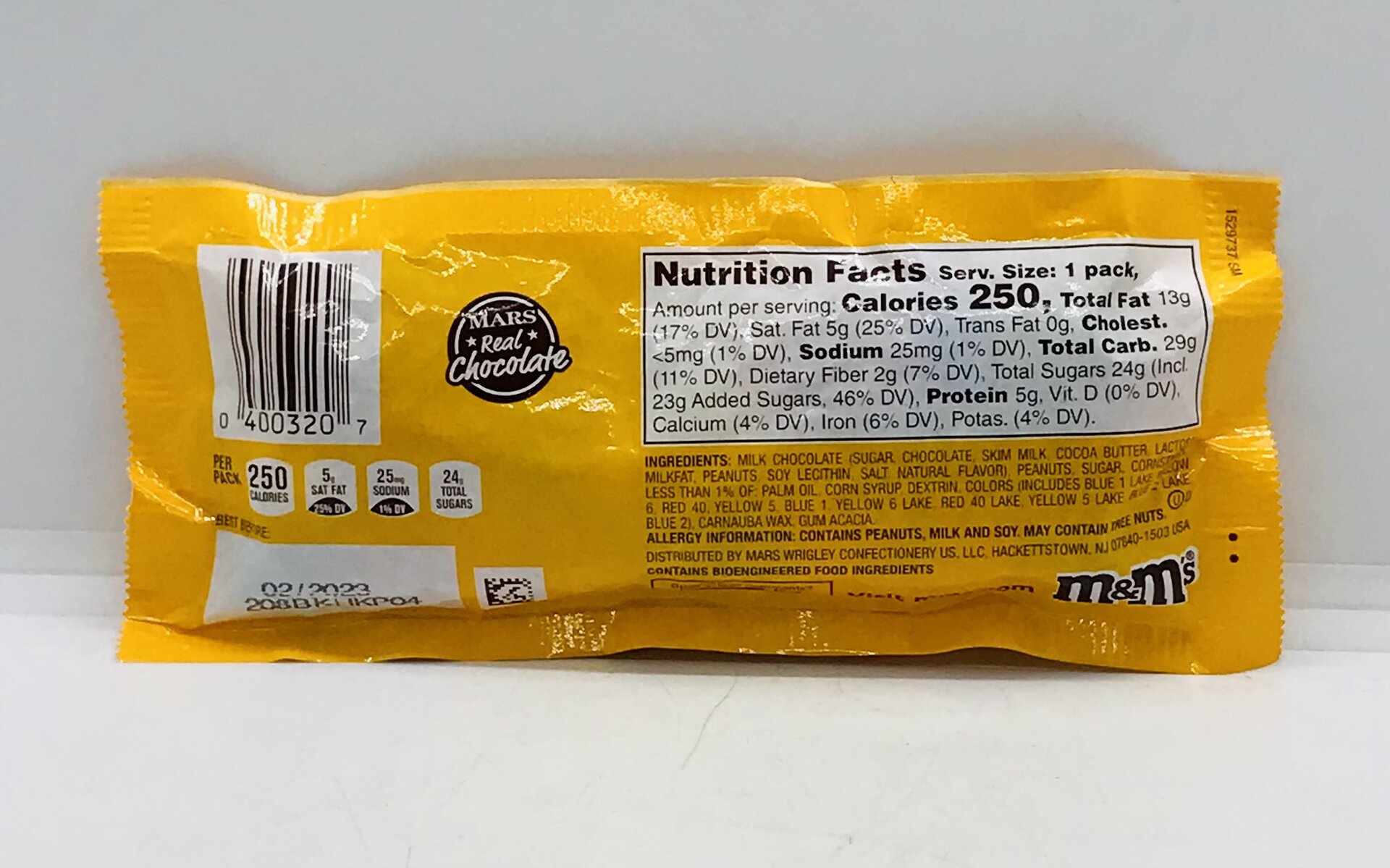 MILK CHOCOLATE (SUGAR CHOCOLATE SKIM MILK, COCOA BUTTER LAC MILKFAS PEANUTS, SOY LECITHIN, SALT, NATURAL FLAVOR), PEANUTS, SUGAR CORNST LESS THAN 1% OF PALM OIL. CORN SYRUP, DEXTRIN, COLORS (INCLUDES BLUE 1 LAKE, Y 6. RED 40 YELLOW 5. BLUE 1. YELLOW 6 LAKE RED 40 LAKE. YELLOW 5 LAKE BLUE 2 BLUE 2) CARNAUBA WAX, GUM ACACIA.