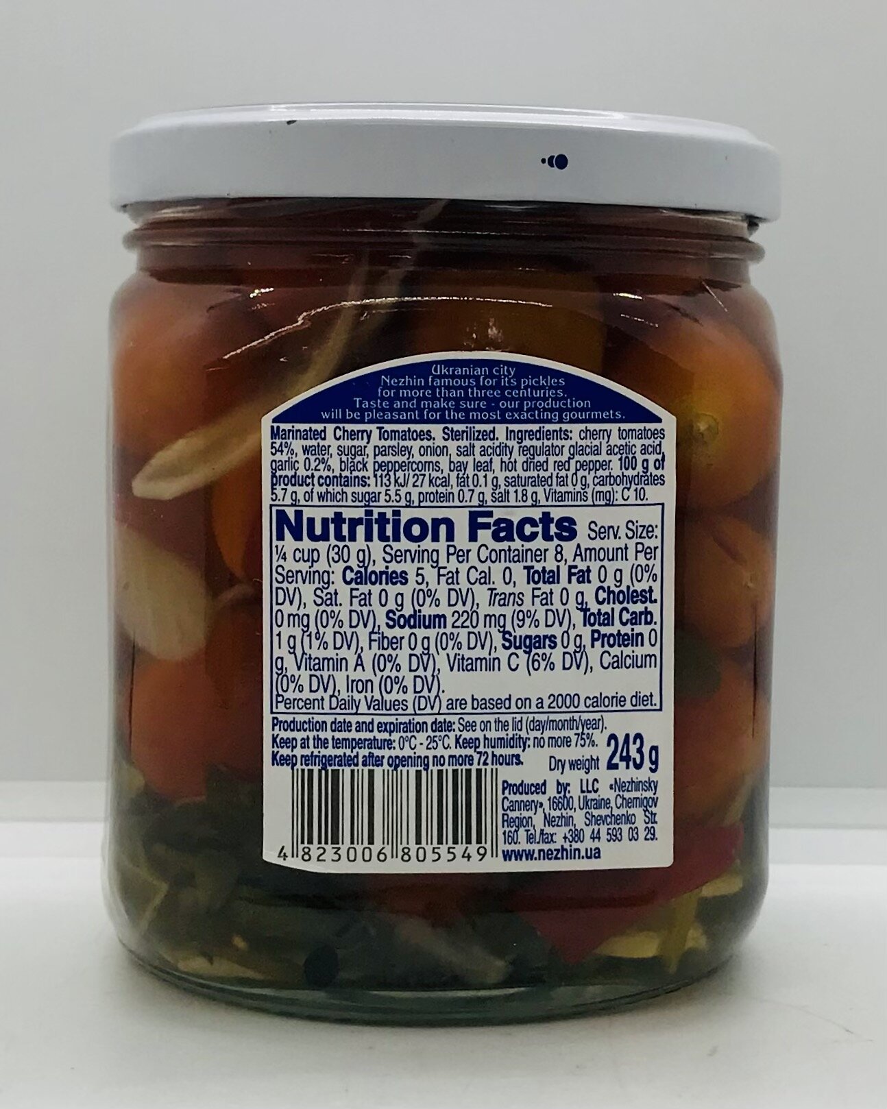 Cherry tomatoes 54%, water, sugar, parsley, onion, salt acidity regulator glacial acetic acid, garlic 0,2%, black peppercorns, bay leaf, hot dried red pepper.