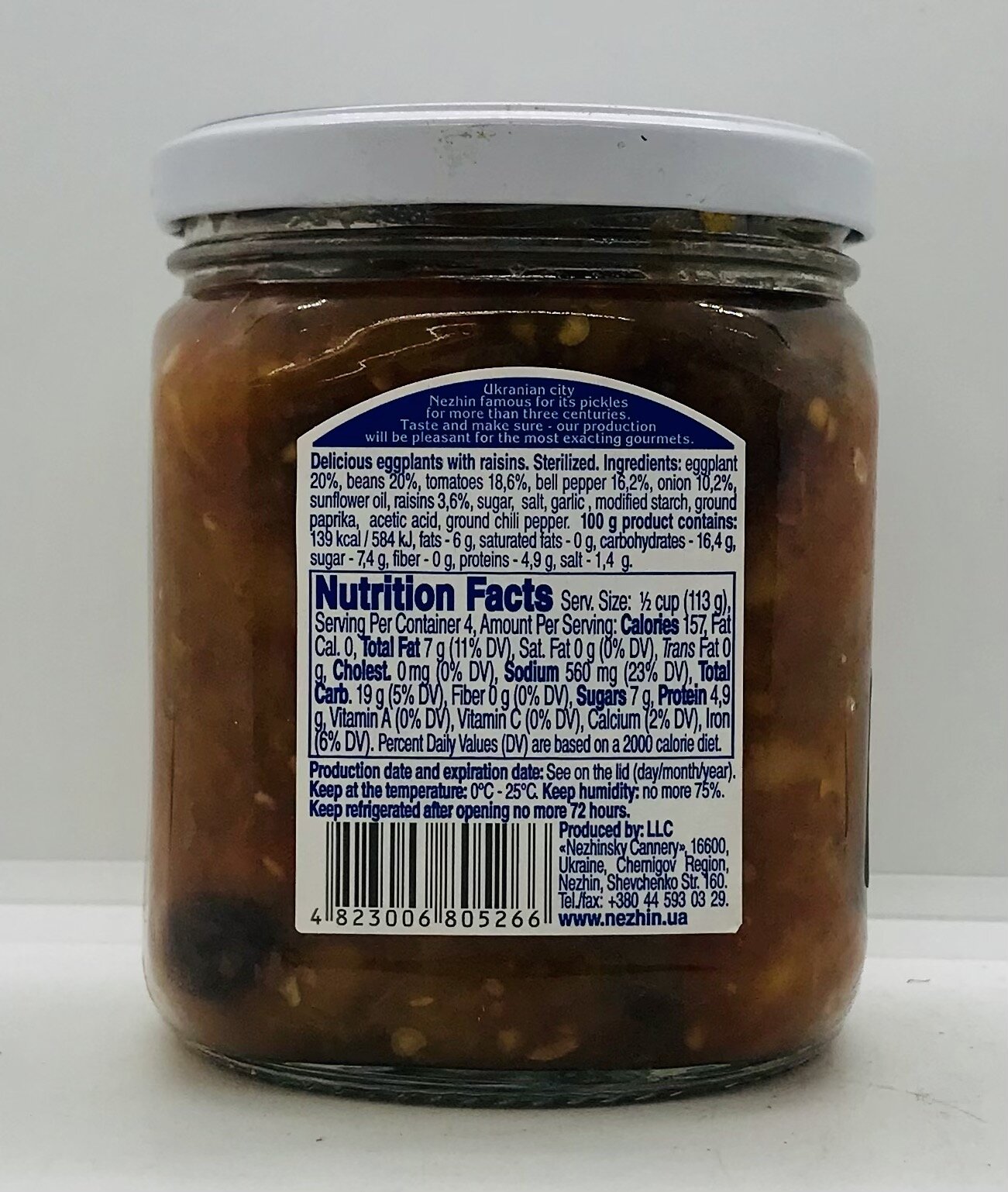 Eggplant 20%, beans 20%, tomatoes 18,6%, bell pepper 16,2%, onion 10,2% sunflower oil, raisins 3,6%, sugar, salt, garlic, modified starch, ground paprika, acetic acid, ground chili pepper.