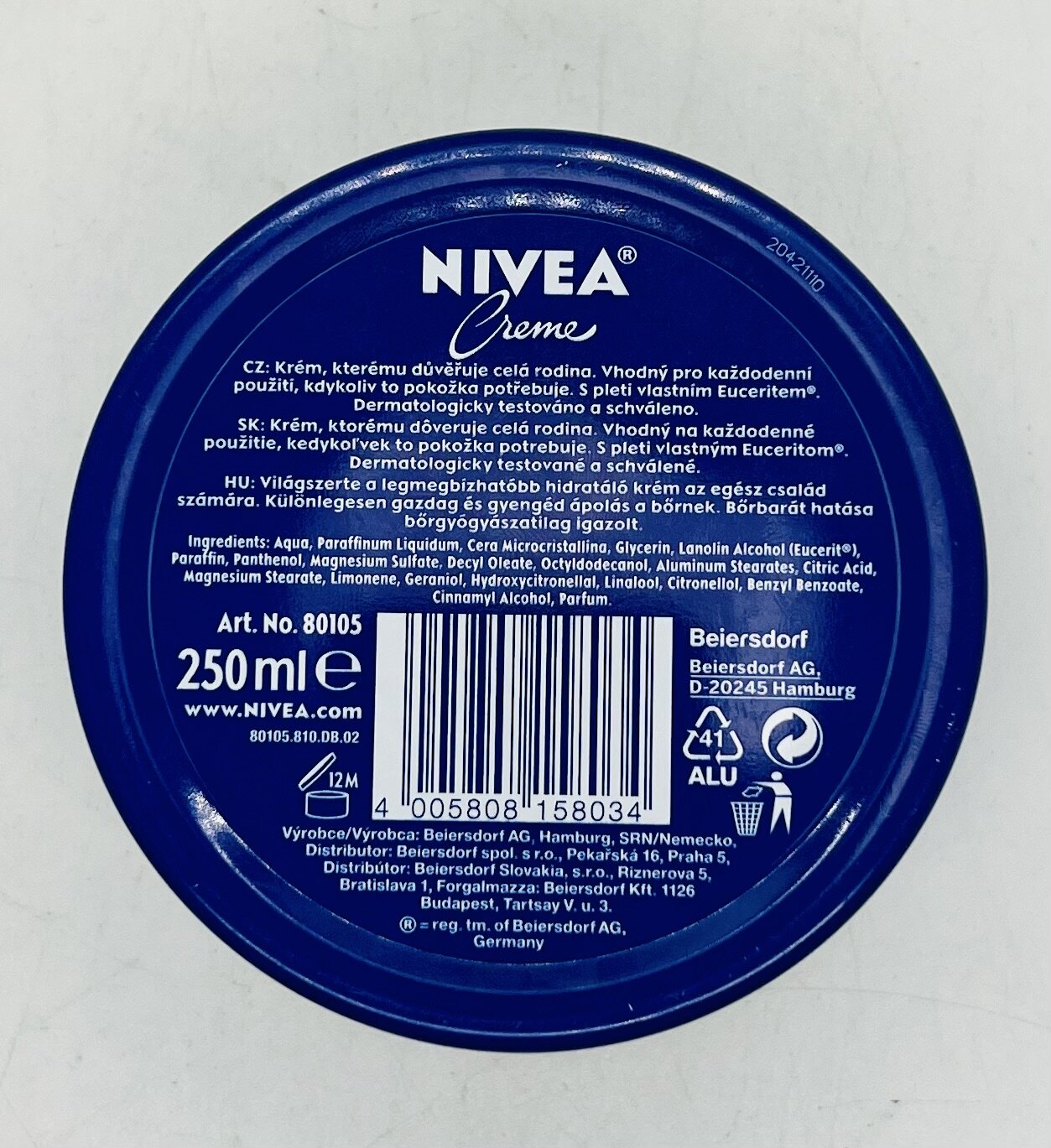 Aqua, Paraffinum Liquidum, Cera Microcristallina, Glycerin, Lanolin Alcohol (Eucerit®), Paraffin, Panthenol, Magnesium Sulfate, Decyl Oleate, Octyldodecanol, Aluminum Stearates, Citric Acid, Magnesium Stearate, Limonene, Geraniol, Hydroxycitronellal, Linalool, Citronellol, Benzyl Benzoate, Cinnamyl Alcohol, Parfum.