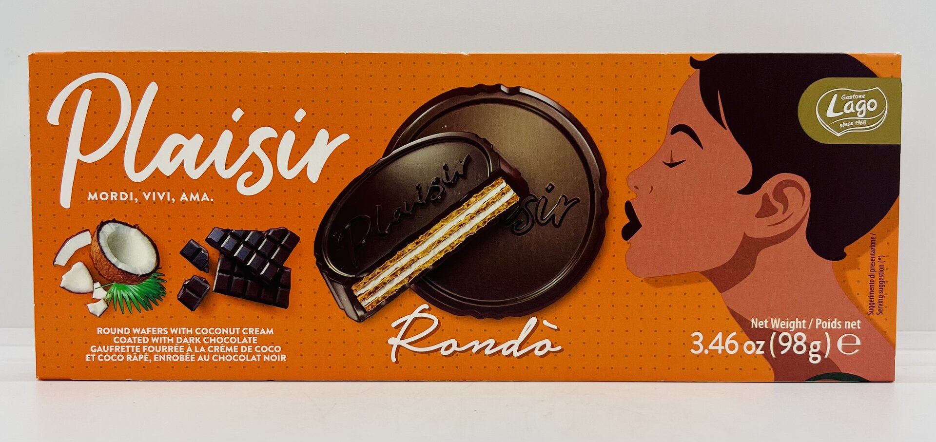 Wafers with coconut cream (31%) and grated coconut, coated with dark chocolate (56%) Ingredients: dark chocolate (sugar, cocoa mass, cocoa butter, butter, emulsifier: soy lecithin, vanilla extract), coconut paste 23%, wheat flour, sugar, grated coconut 4%, coconut oil, emulsifier: soy lecithin, salt, raising agent: sodium hydrogen carbonate.