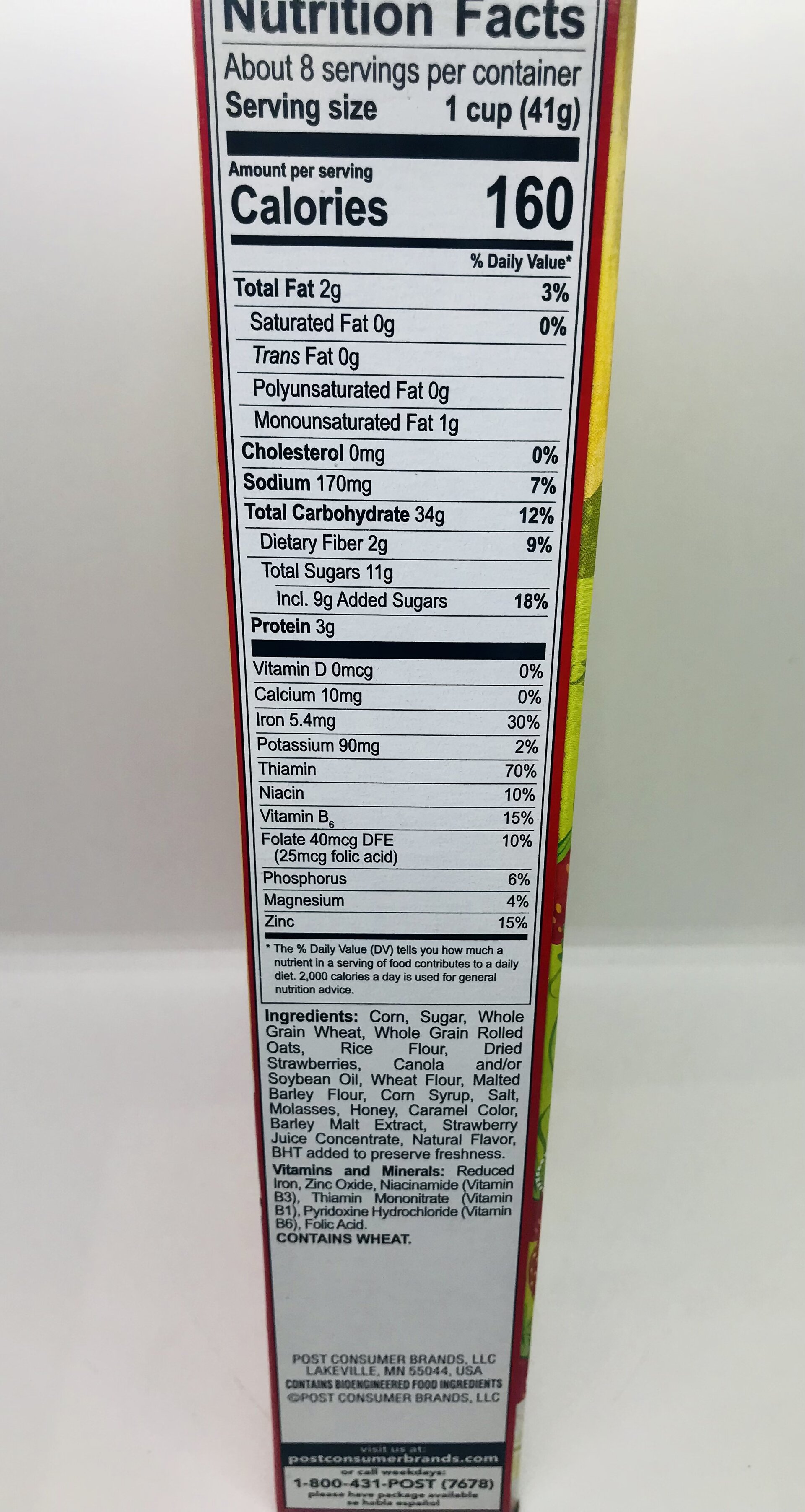 Corn, sugar, whole grain wheat, whole grain rolled oats, rice flour, dried strawberries, canola and/or soybean oil, wheat flour, malted barley flour, corn syrup, salt, molasses, honey, caramel color, barley malt extract, strawberry juice concentrate, natural flavor, BHT added to preserve freshness.