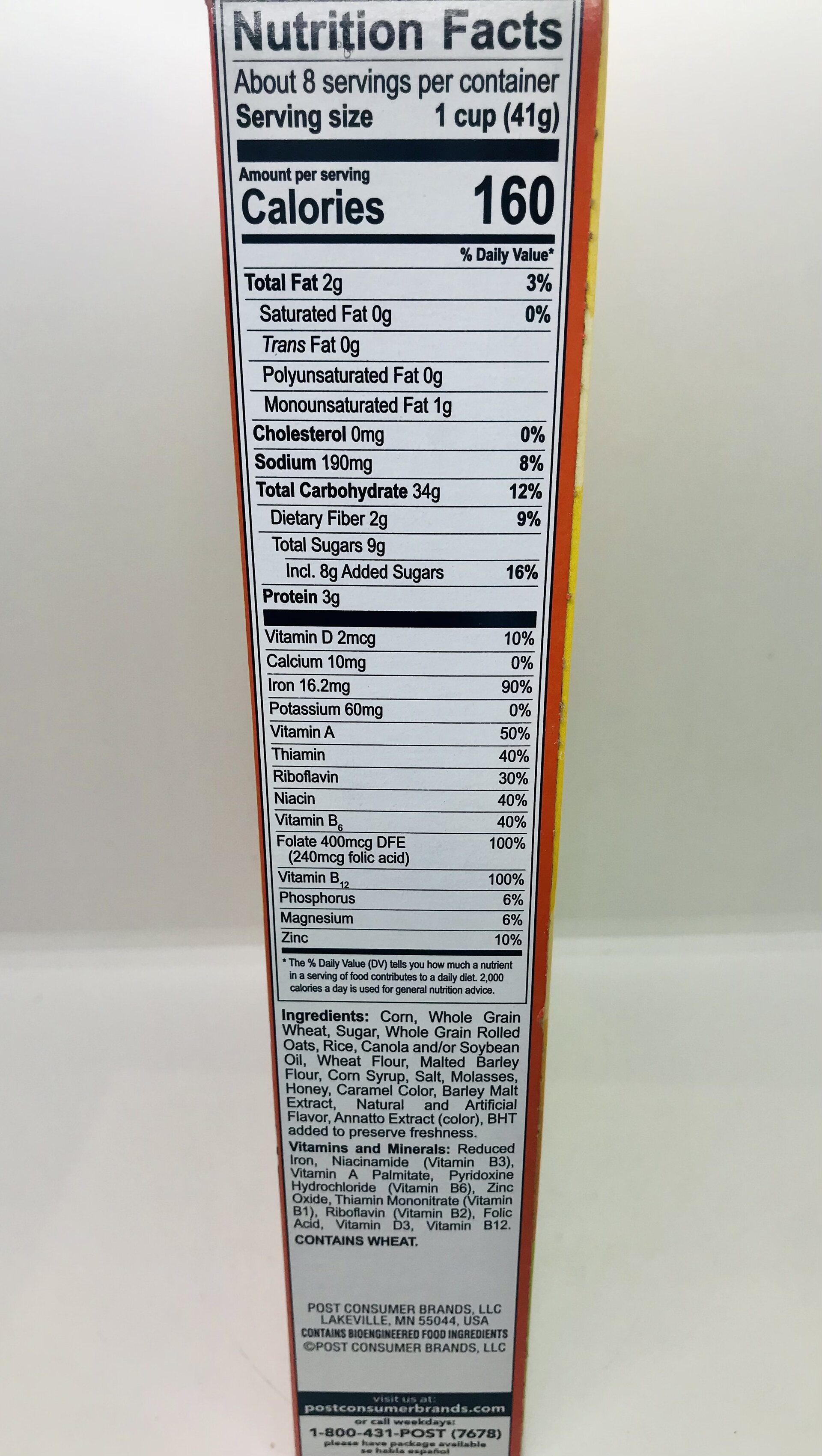 Corn, whole grain wheat, sugar, whole grain rolled oats, rice, canola and/or soybean oil, wheat flour, malted barley flour, corn syrup, salt, molasses, honey, caramel color, barley malt extract, natural and artificial flavor, annatto extract, BHT added to preserve freshness.