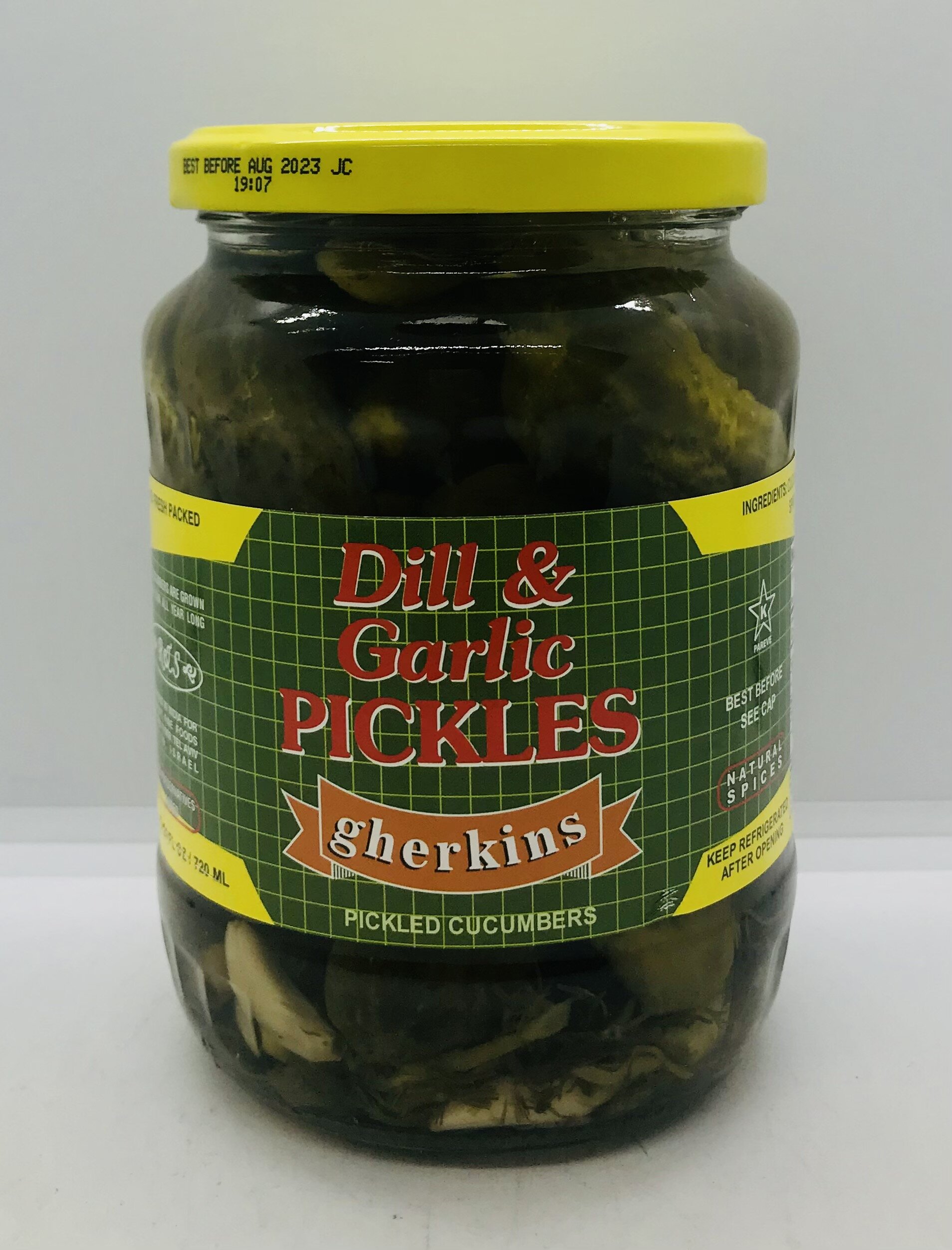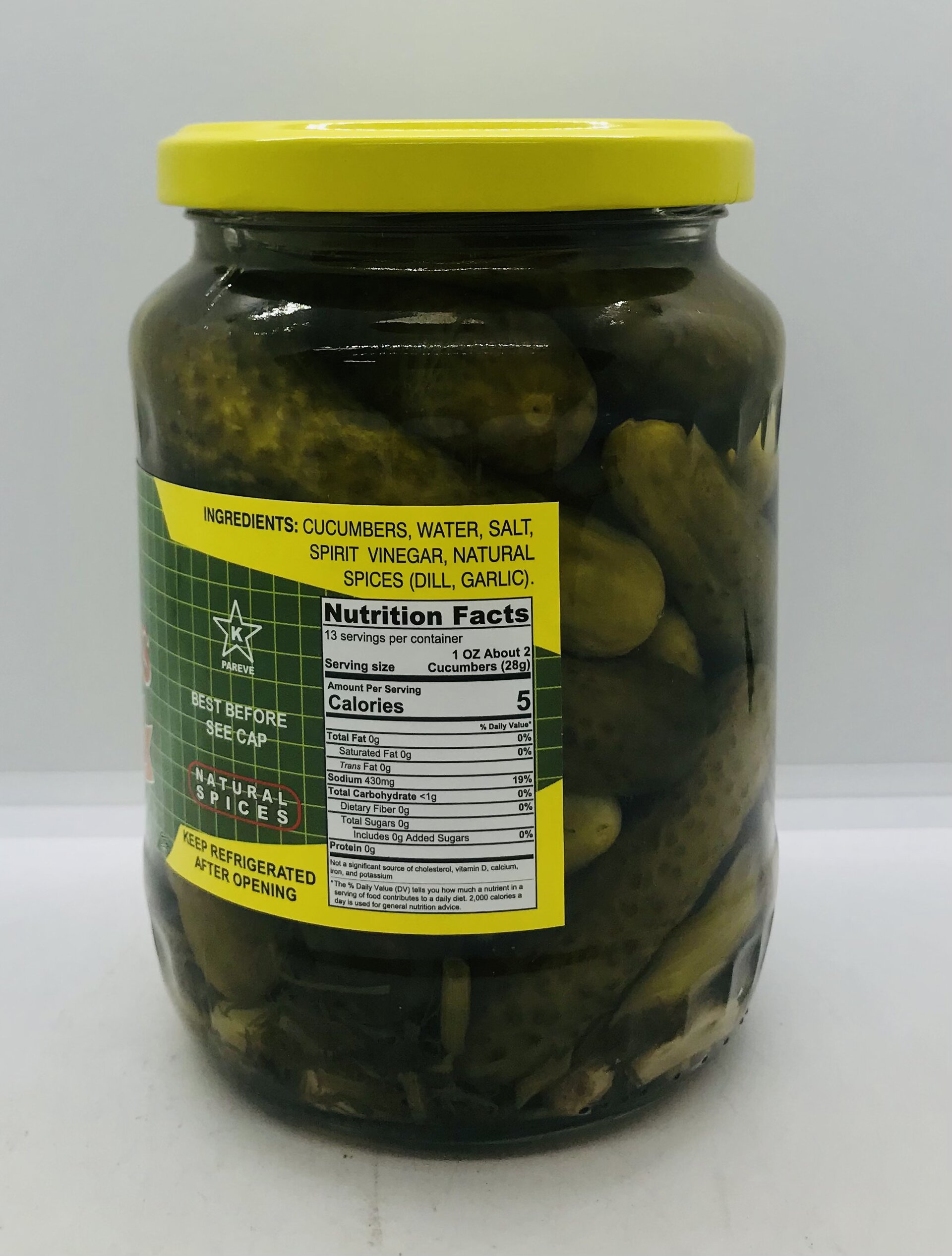 Cucumbers, water, salt, spirit vinegar, natural spices (dill, garlic).