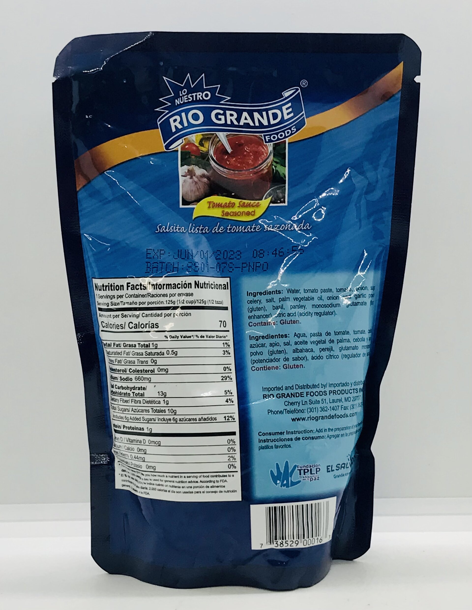 Water, tomato paste, tomato, onion, sugar, celery, salt, palm vegetable oil, onion and garlic powder (gluten), basil, parsley, monosodium glutamate (flavor enhancer), citric acid (acidity regulator).