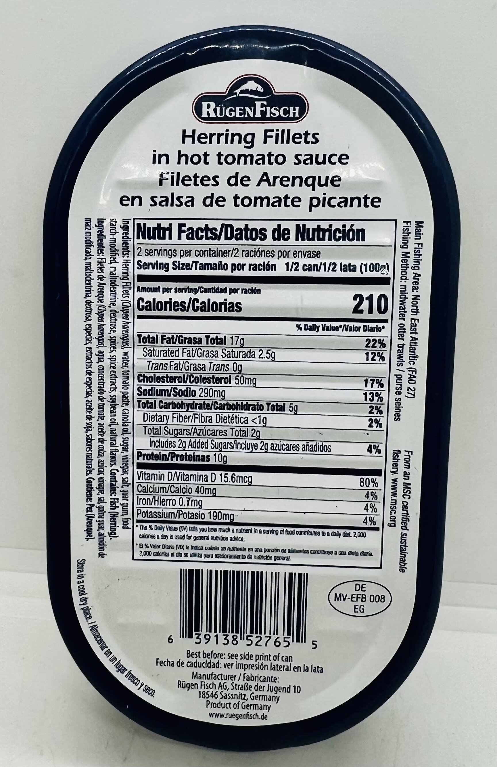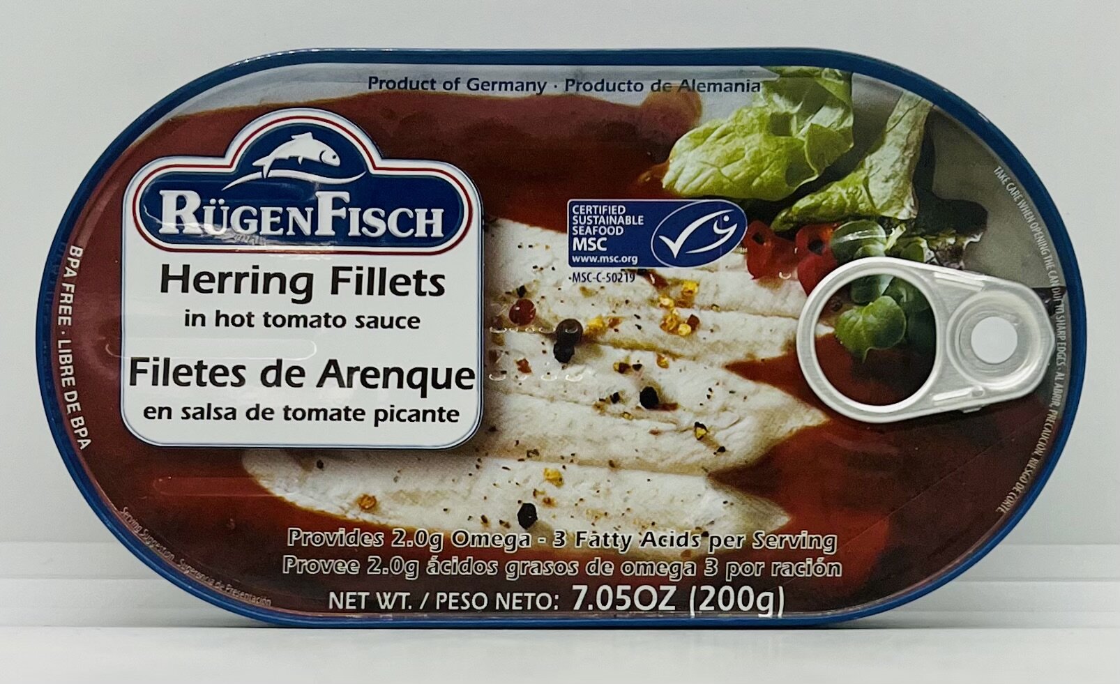 Herring Fillets (Clupea harangues), water, tomato paste, canola oil, sugar, vinegar, salt, guar gum, food starch-modified, maltodextrin, dextrose, spices, spice extracts, soybean oil, natural flavors.