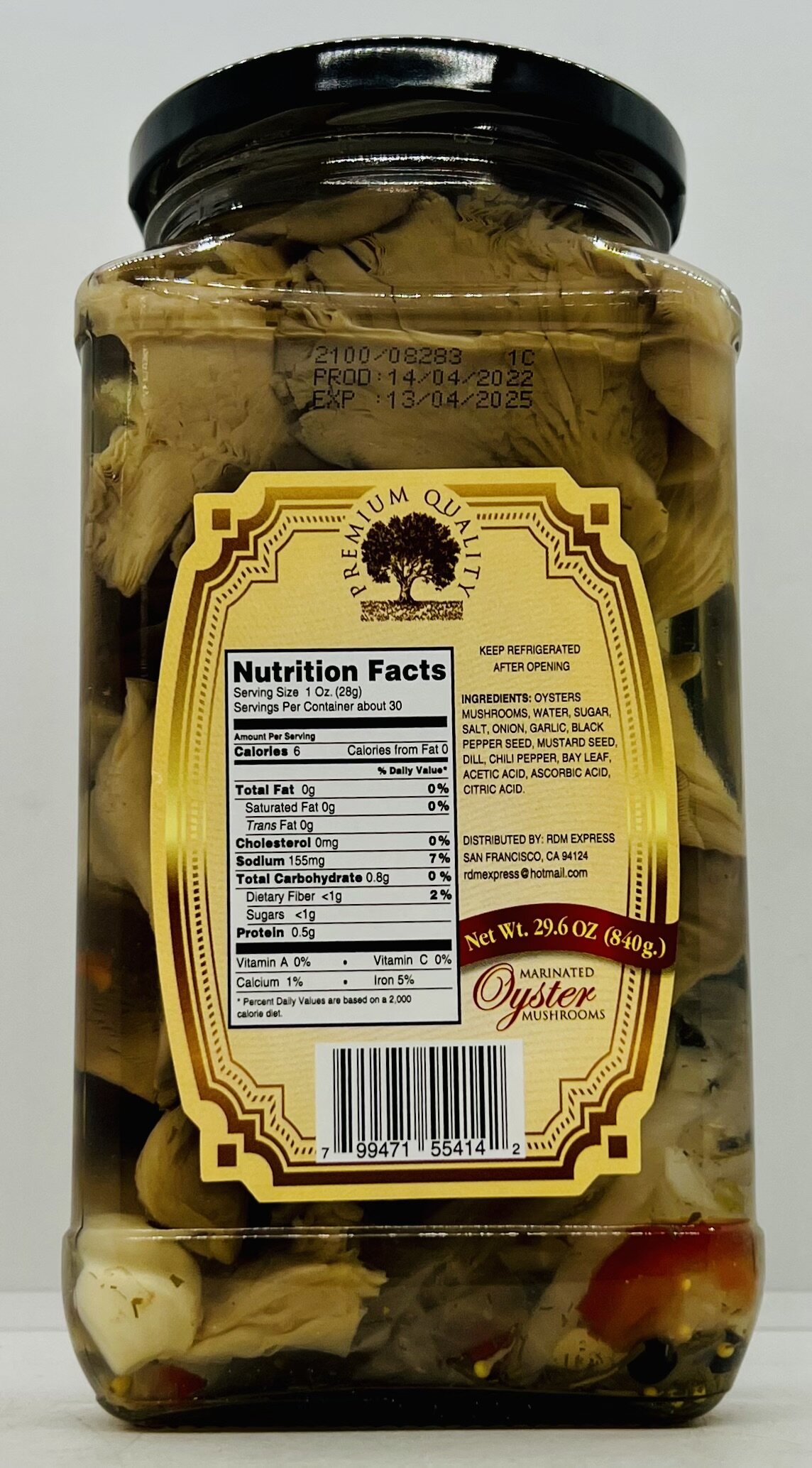 Oysters mushrooms, water, sugar, salt, onion, garlic, black pepper seed, mustard seed, dill, chili pepper, bay leaf, acetic acid, ascorbic acid.