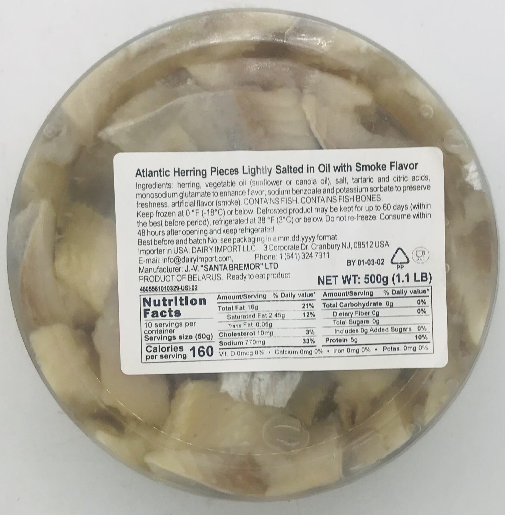 Herring, vegetable oil (sunflower or canola oil), salt, tartaric and citric acids, monosodium glutamate to enhance flavor, sodium benzoate and potassium sorbate to preserve freshness, artificial flavor (smoke).