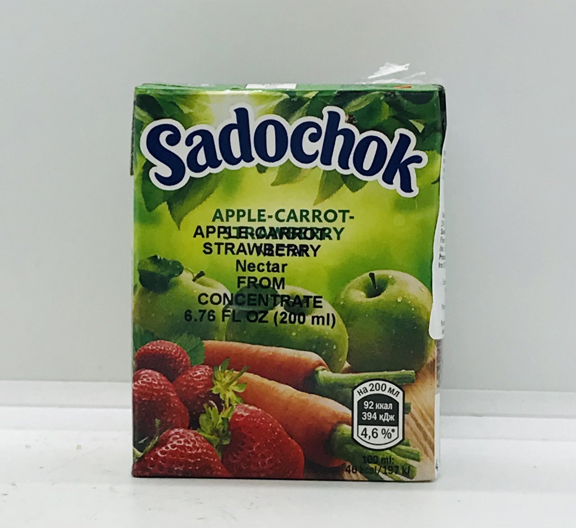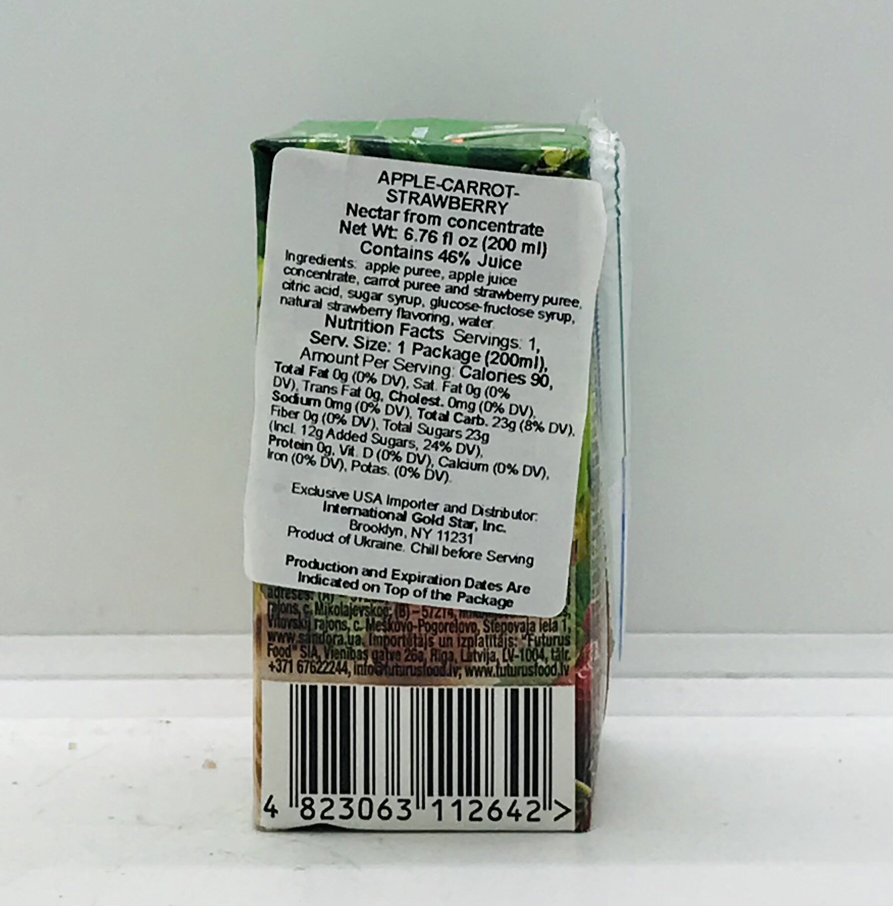 Apple puree, apple juice concentrate, carrot puree and strawberry puree, citric acid, sugar syrup, glucose-fructose syrup, natural strawberry flavoring, water.