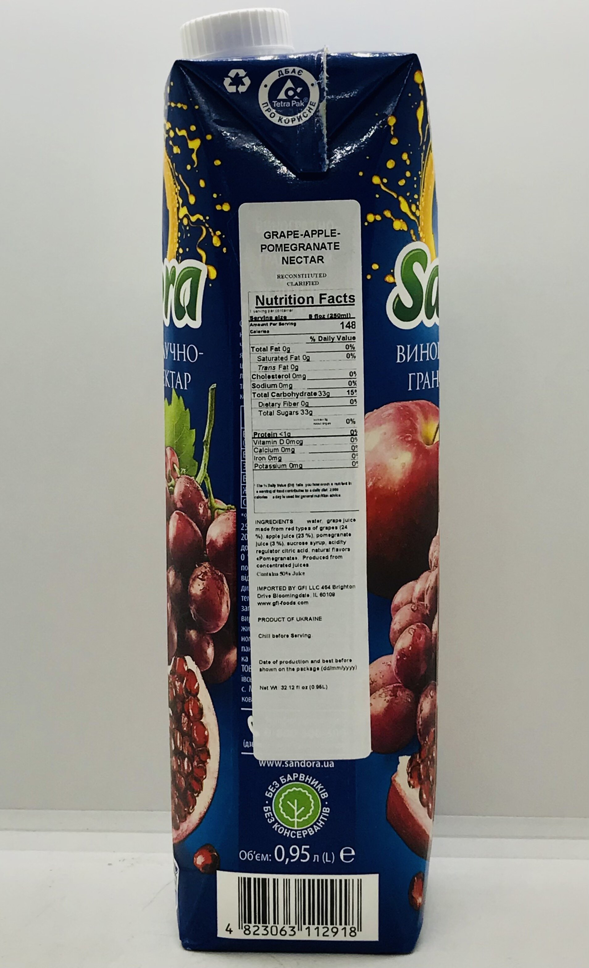 Water, grape juice made from red types of grapes, apple juice, pomegranate juice, sucrose syrup, acidity regulator citric acid, natural flavors Pomegranate.