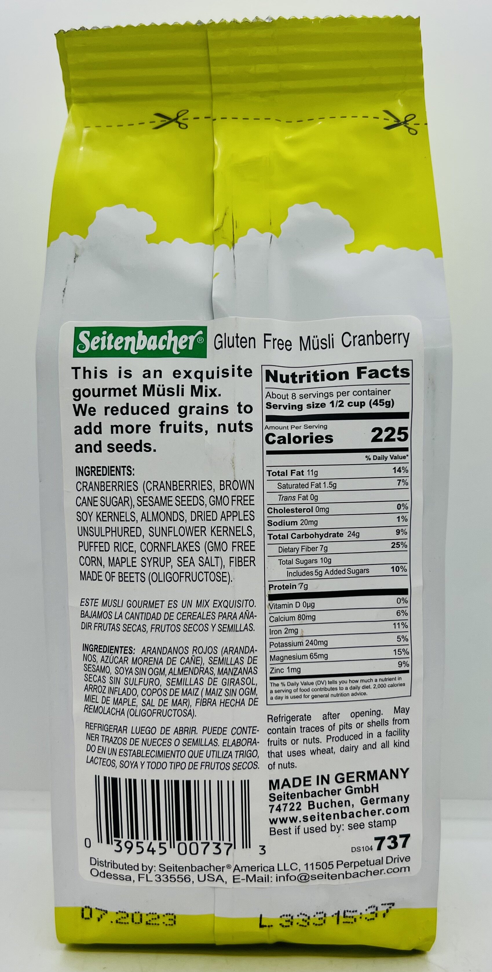 CRANBERRIES (CRANBERRIES, BROWN CANE SUGAR), SESAME SEEDS, GMO FREE SOY KERNELS, ALMONDS, DRIED APPLES UNSULPHURED, SUNFLOWER KERNELS, PUFFED RICE, CORNFLAKES (GMO FREE CORN, MAPLE SYRUP, SEA SALT), FIBER MADE OF BEETS (OLIGOFRUCTOSE).