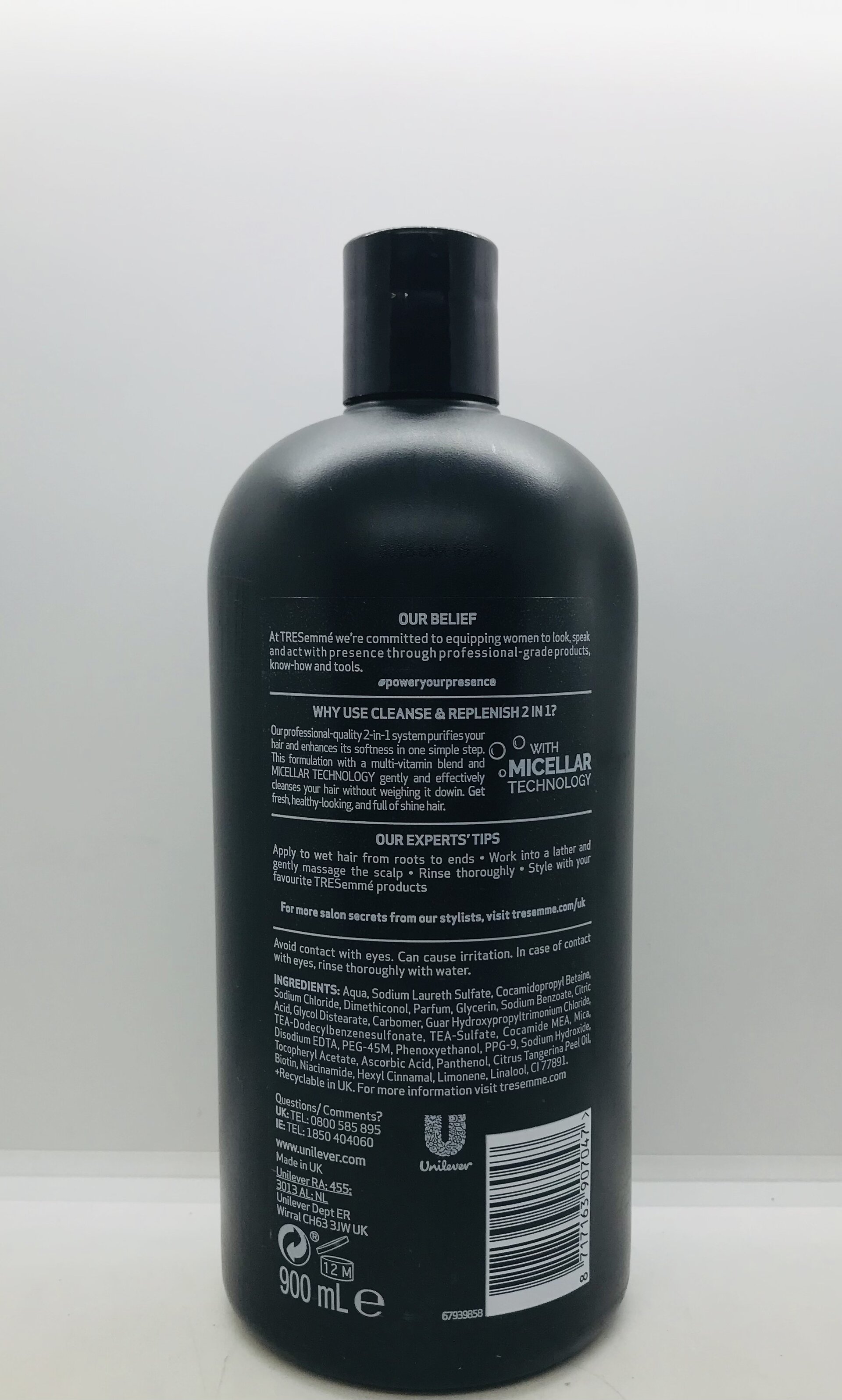 Aqua, Sodium Laureth Sulfate, Cocamidopropyl Betaine, Sodium Chloride, Dimethiconol, Parfum, Glycerin, Sodium Benzoate, Citric Acid Glycol Distearate, Carbomer, Guar Hydroxypropyltrimonium Chloride, TEA-Dodecylbenzenesulfonate, TEA-Sulfate, Cocamide MEA, Mica, Disodium EDTA, PEG-45M, Phenoxyethanol, PPG-9, Sodium Hydroxide, Tocopheryl Acetate, Ascorbic Acid, Panthenol, Citrus Tangerina Peel Oil, Biotin, Niacinamide, Hexyl Cinnamal, Limonene, Linalool, CI 77891. Recyclable in UK.