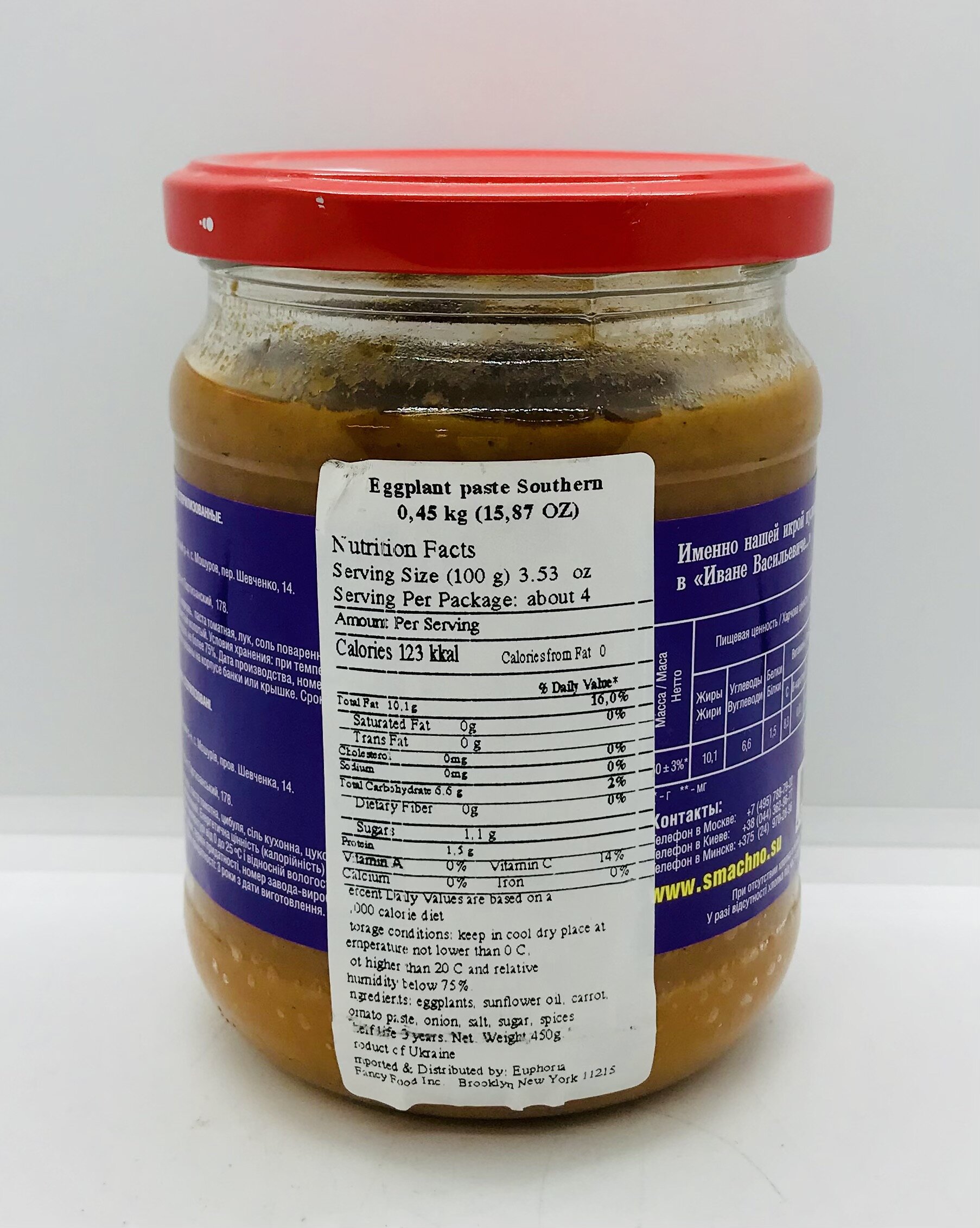 Eggplants, sunflower oil, carrot, tomato paste, onion, salt, sugar, spices.