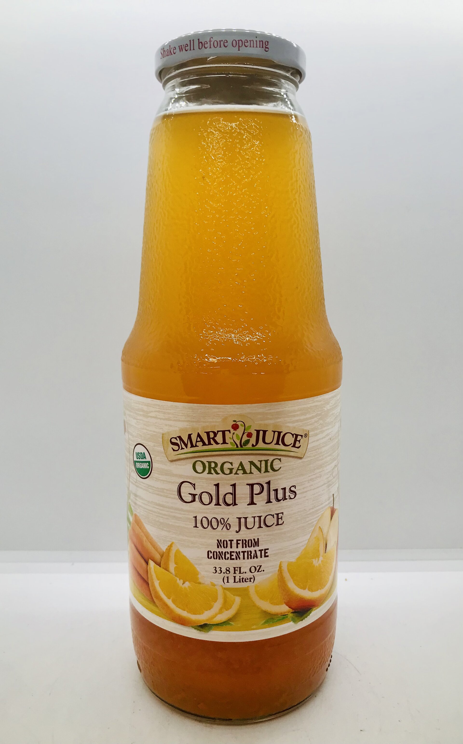 Organic apple juice, organic orange juice, organic carrot juice.
