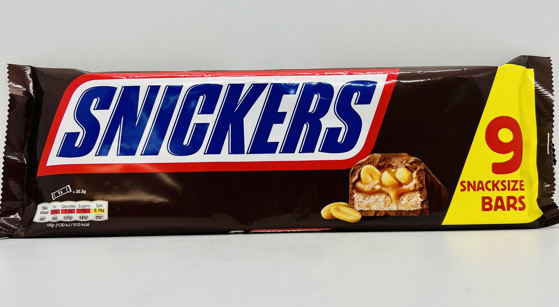 Milk chocolate (35%), with soft nougat (14%) and caramel centre (27%) with fresh roasted peanuts (24%). Ingredients: sugar, glucose syrup, peanuts, cocoa butter, skimmed milk powder, cocoa mass, lactose, sunflower oil, milk fat, whey powder (from milk), palm fat, salt, emulsifier (soya lecithin), egg white powder, milk protein, natural vanilla extract.