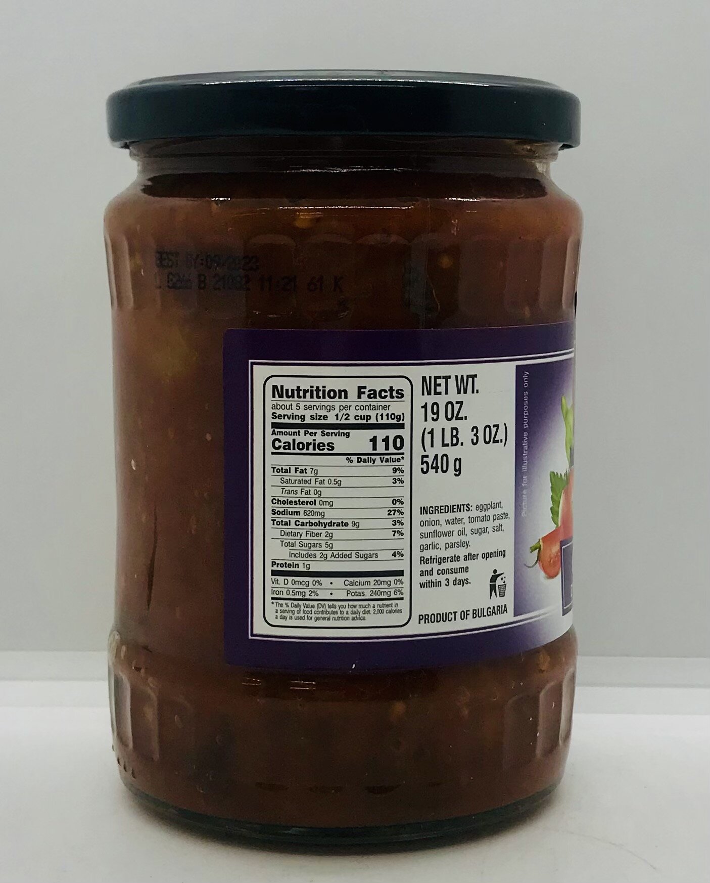 Eggplant, onion, water, tomato paste, sunflower oil, sugar, salt, garlic, parsley.