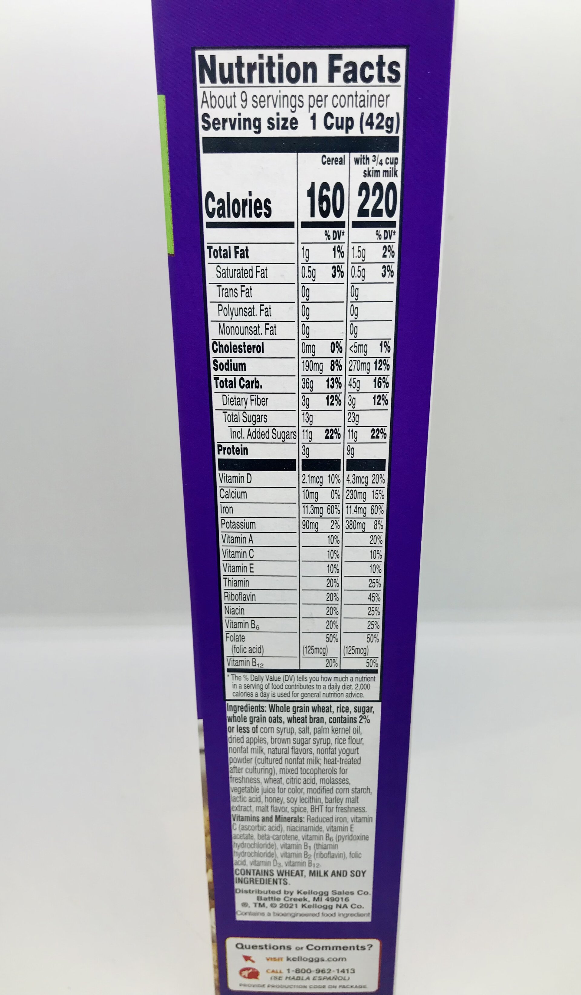 Whole grain wheat, rice, sugar, whole grain oats, wheat bran, contains 2% or less of corn syrup, salt, palm kernel oil, dried apples, brown sugar syrup, rice flour, nonfat milk, natural flavors.