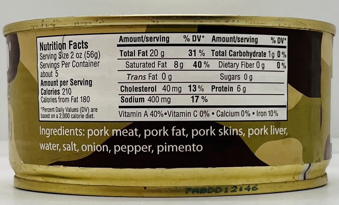 Pork meat, pork fat, pork skins, pork liver, water, salt, onion, pepper, pimento.